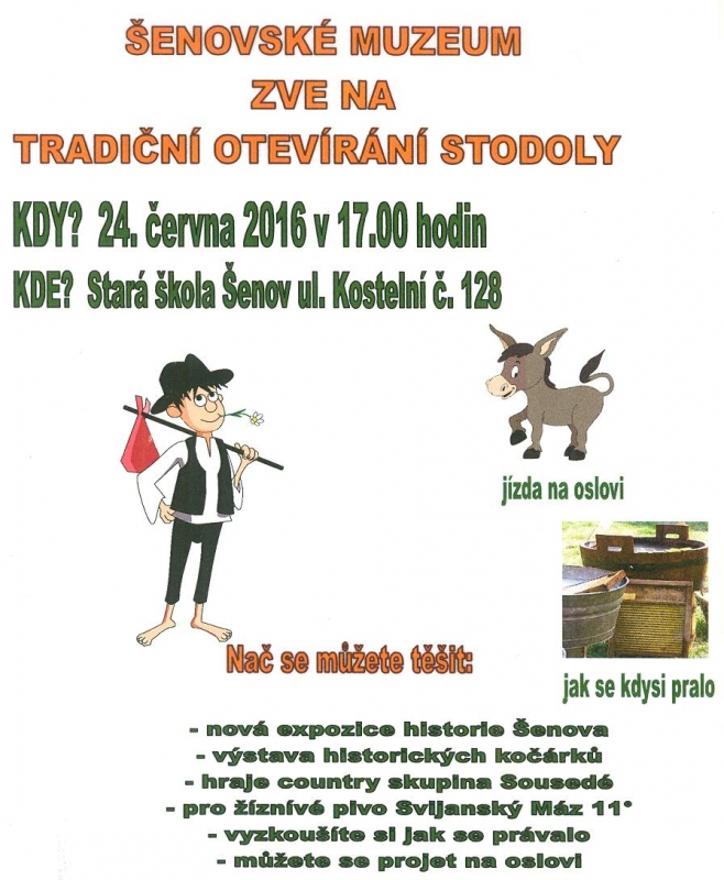 Otevírání stodoly v Šenovském muzeu Šenovské muzem pořádá v pátek 24. 6. od 17:00 v areálu "Staré školy" tradiční "Otevírání stodoly" s doprovodným kulturním programem a s občerstvením. Více viz přiložený leták.