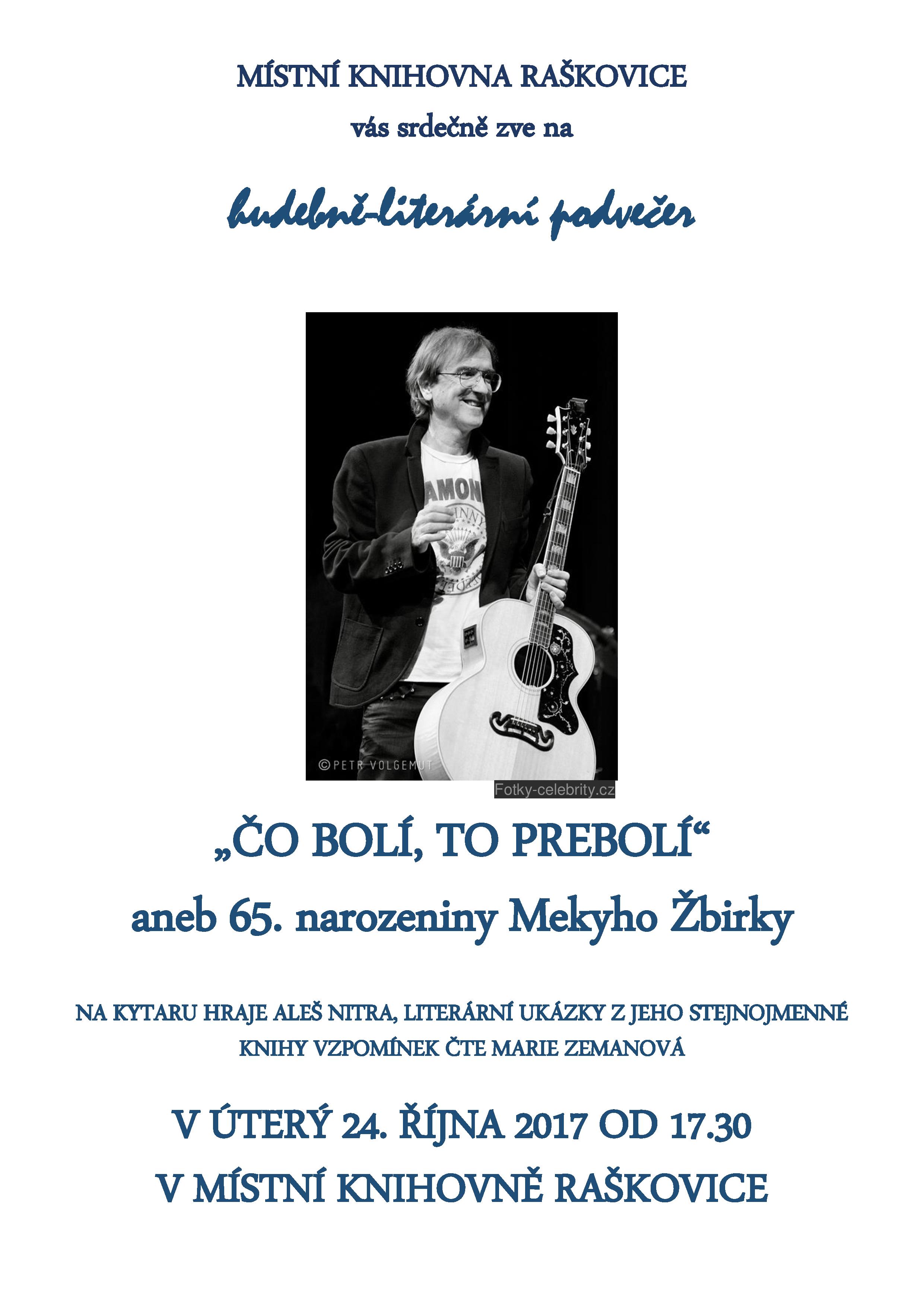 V úterý 24. října 2017 od 17:30 vás srdečně zveme do Místní knihovny Raškovice na hudebně-literární podvečer "Čo bolí, to prebolí" aneb 65. narozeniny Mekyho Žbirky.