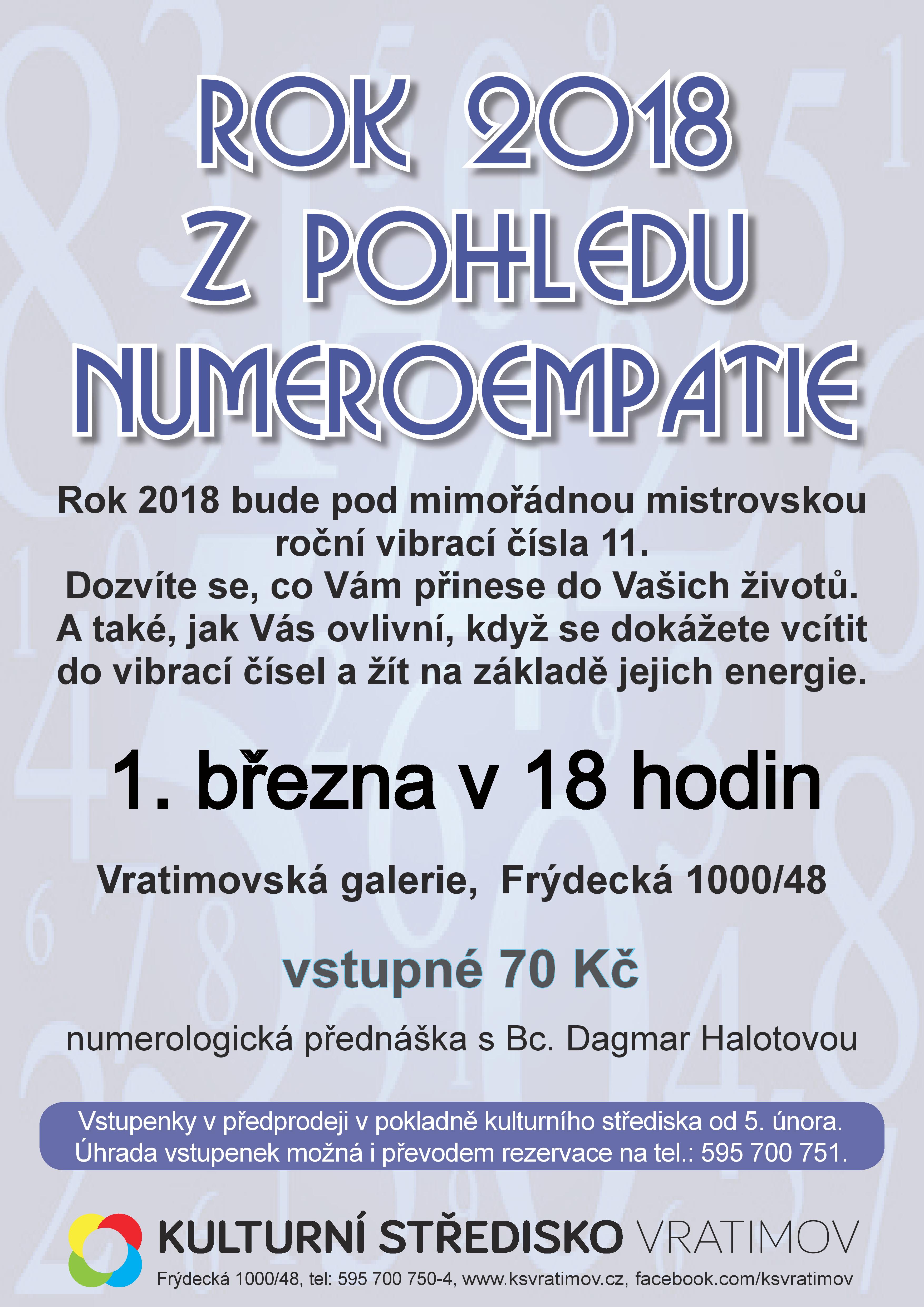 Ve čtvrtek 1. března 2018 od 18 hodin vás srdečně zveme do KS Vratimov na numerologickou přednášku Bc. Dagmar Holotové.