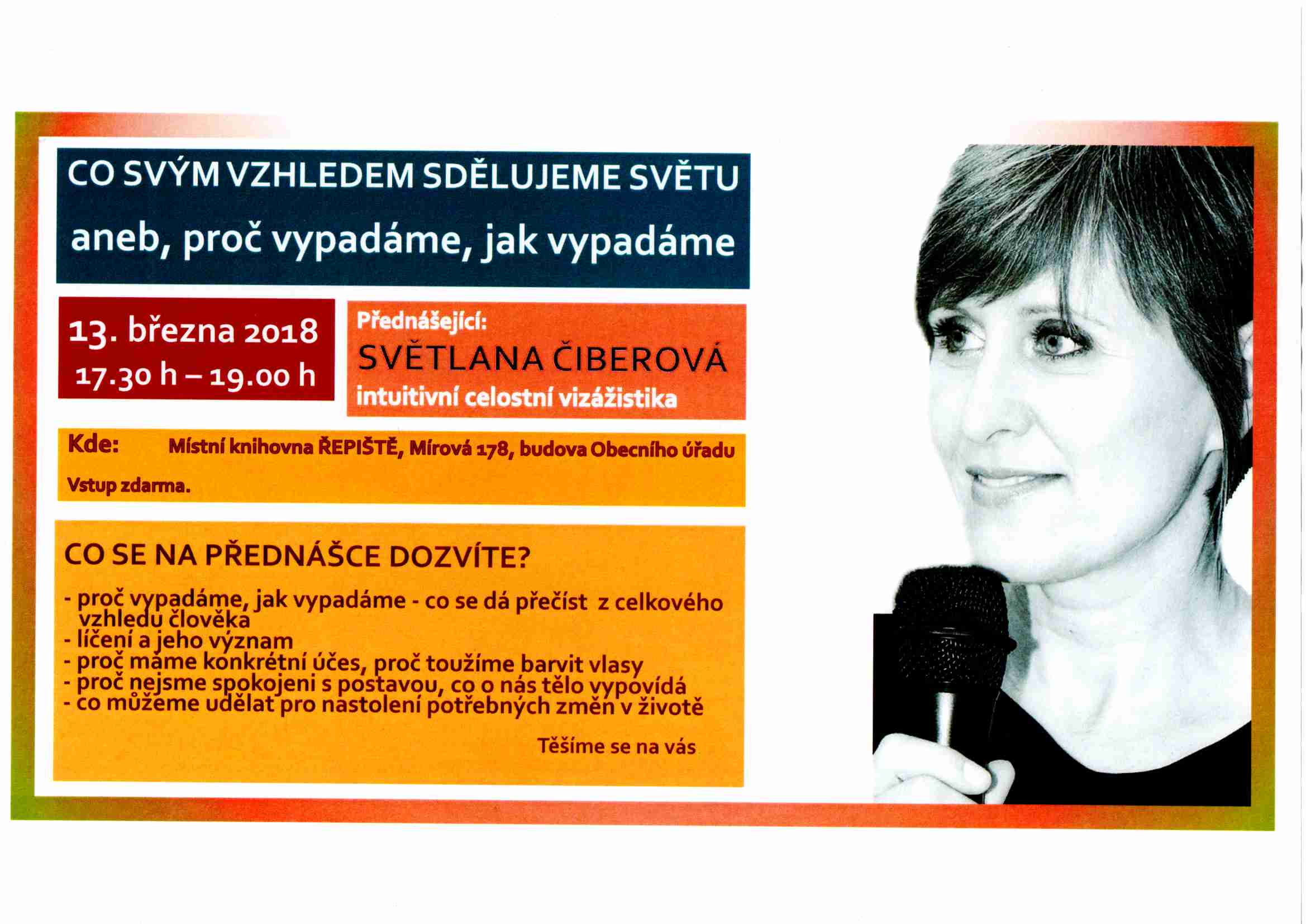 V úterý 13. března 2018 od 17:30 hodin vás srdečně zveme do knihovny v Řepištích na přednášku Světlany Čiberové.