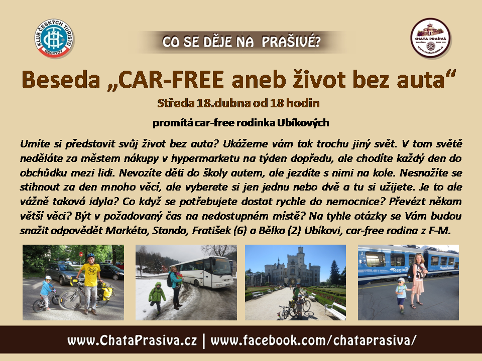 Ve středu 18. dubna 2018 od 18 hodin vás srdečně zveme na besedu "CAR-FREE aneb život bez auta". Promítá car-free rodinka Ubíkových.