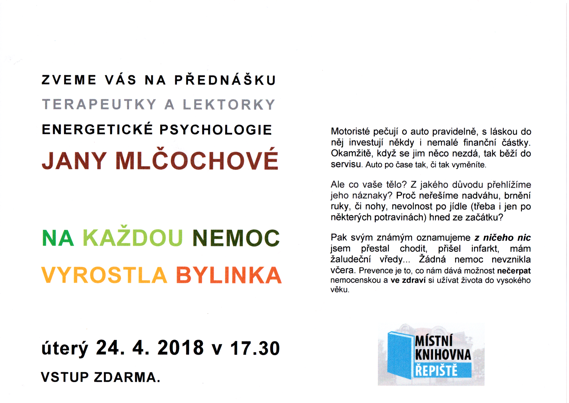 V úterý 24. dubna 2018 od 17:30 hodin vás srdečně zveme na přednášku terapeutky a lektorky energické psychologie Jany Mlčochové "Na každou nemoc vyrostla bylinka".