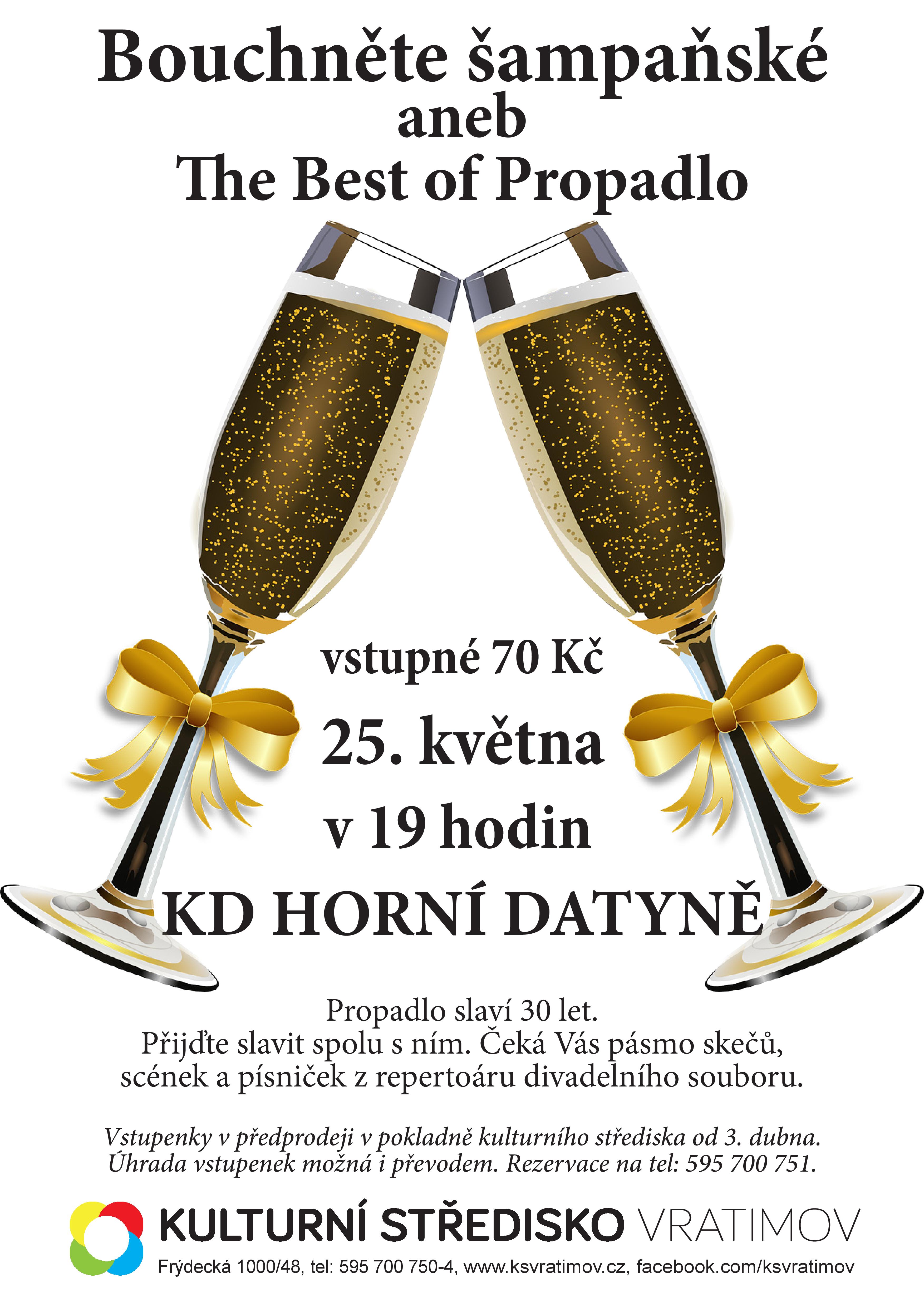 V pátek 25. května 2018 od 19 hodin vás srdečně zveme na představení divadelního souboru Propadlo s názvem "Bouchněte šampáňo aneb The Best of Propadlo.