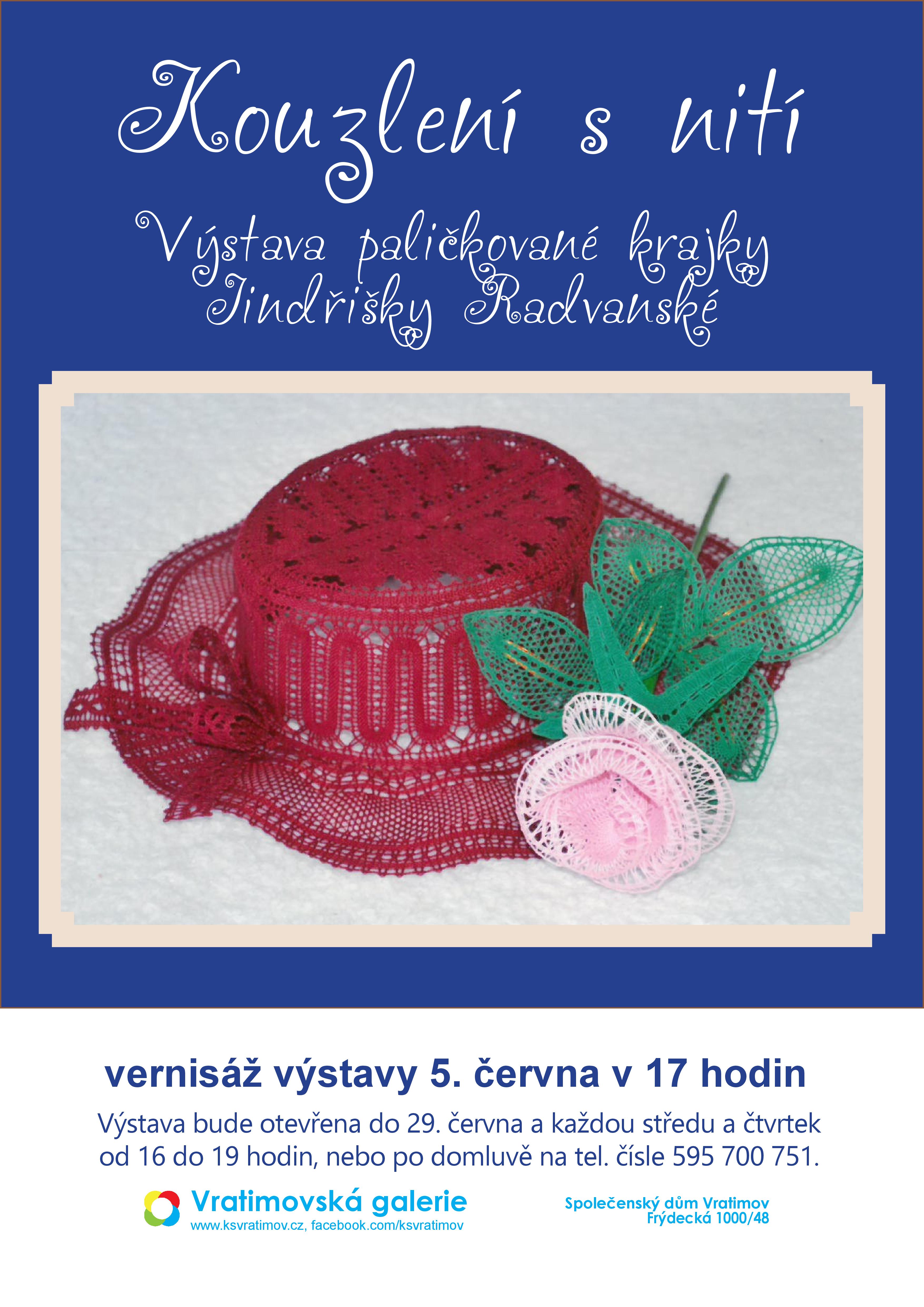 V úterý 5. června 2018 od 17 hodin Vás zveme do galerie KS Vratimov na vernisáž výstavy paličkované krajky Jindřišky Radvanské. Výstava bude otevřena do 29. června, každou středu a čtvrtek od 16 do 19 hodin.