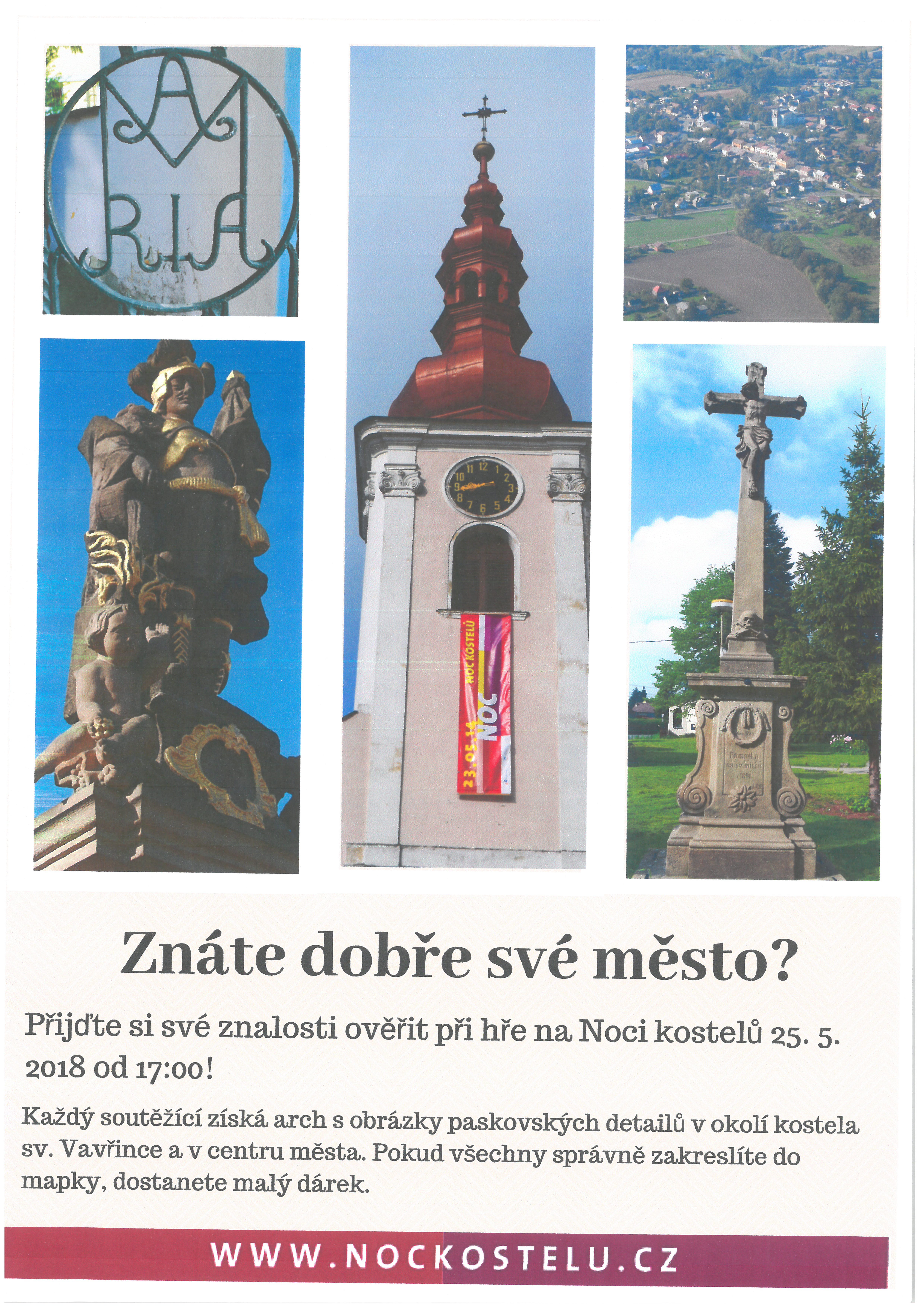 Přijďte si v pátek 25. května 2018 od 17 hodin ověřit své znalosti. U příležitosti Nocikostelů je pro vás nachystaná vědomostní hra "Znáte dobře své město?"