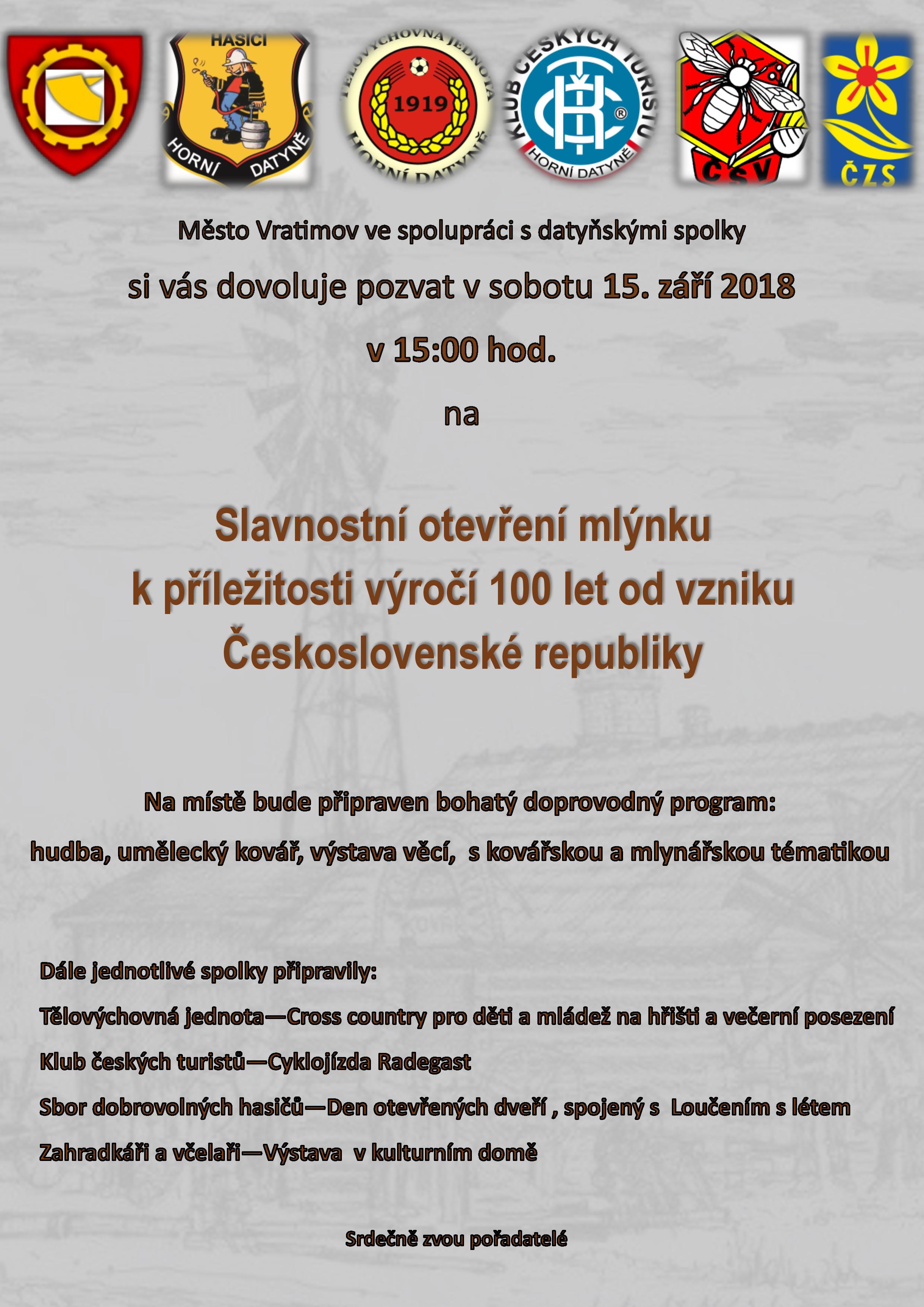 V sobotu 15. září 2018 od 15 hodin vás zvene na slavnostní otevření mlýnku v Horních Datyních.