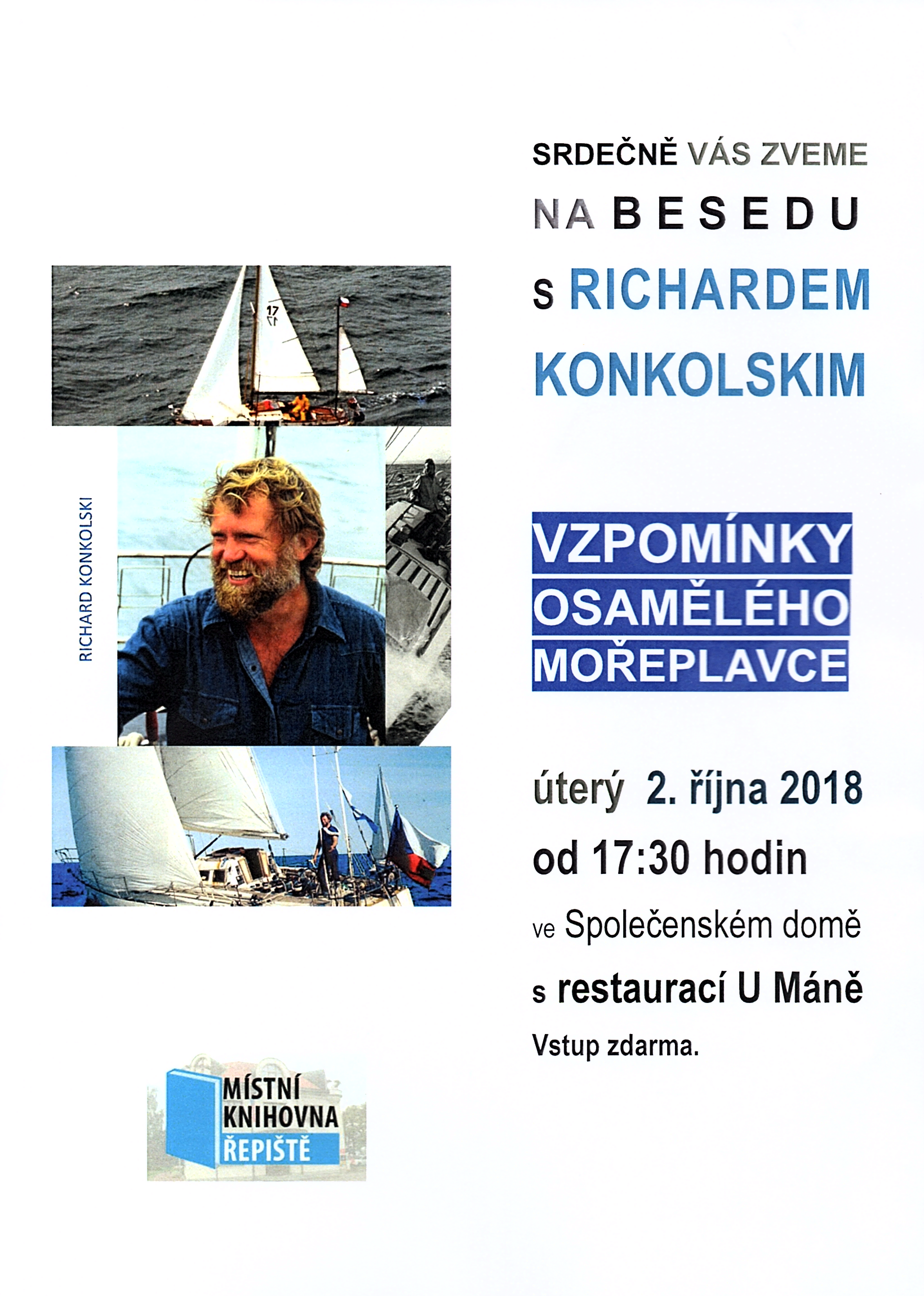 V úterý 2. října 2018 od 17:30 hodin vás místní knihovna v Řepištích srdečně zve do Společenského domu U Máně na besedu s Richardem Konkolskim "Vzpomínky osamělého mořeplavce".