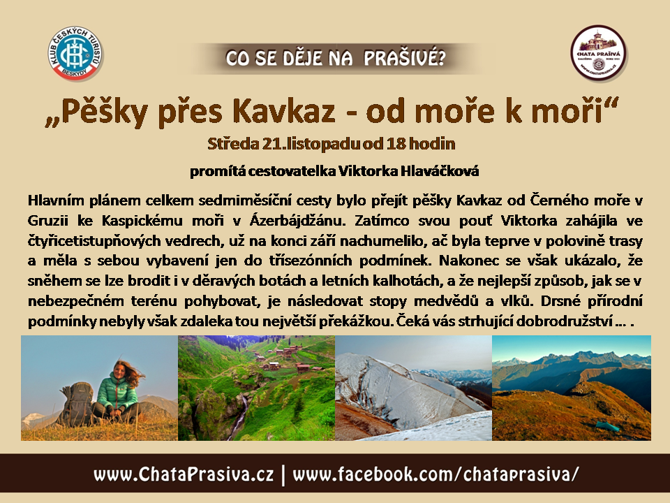 Ve středu 21. listopadu 2018 od 18 hodin vás srdečně zveme na promítání Viktorky Hlaváčové "Pěšky přes Kavkaz - od moře k moři".