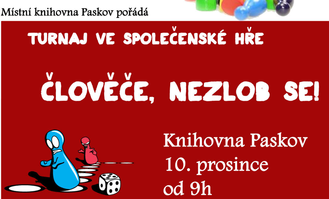 V sobotu 10. prosince 2016 vás srdečně zveme na turnaj ve společenské hře Člověče, nezlob se, který se uskuteční od 9 hodin v knihovně v Paskově.