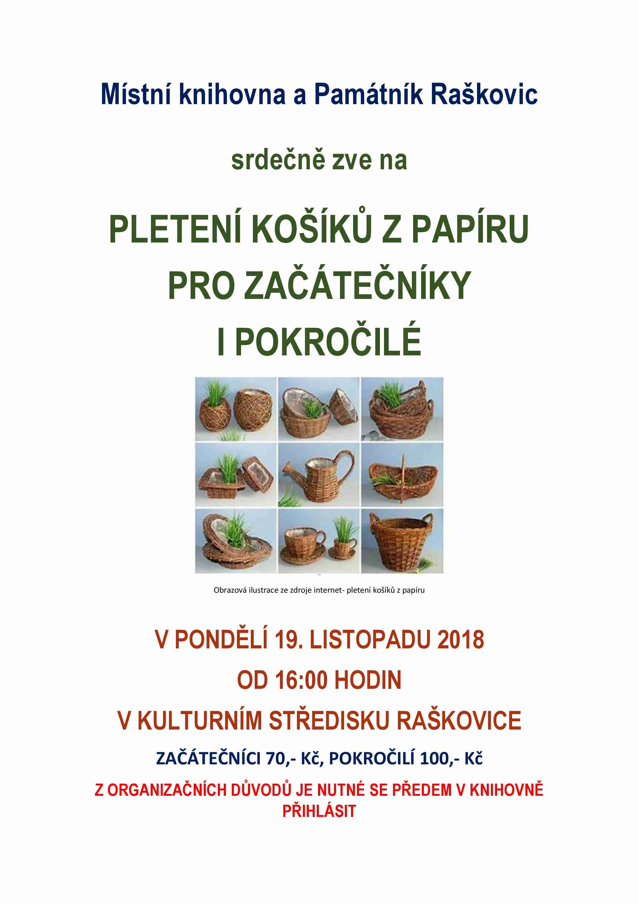 V pondělí 19. listopadu 2018 od 16 hodin vás srdečně zve na workshop „Pletení košíků z papíru pro začátečníky i pokročilé“.