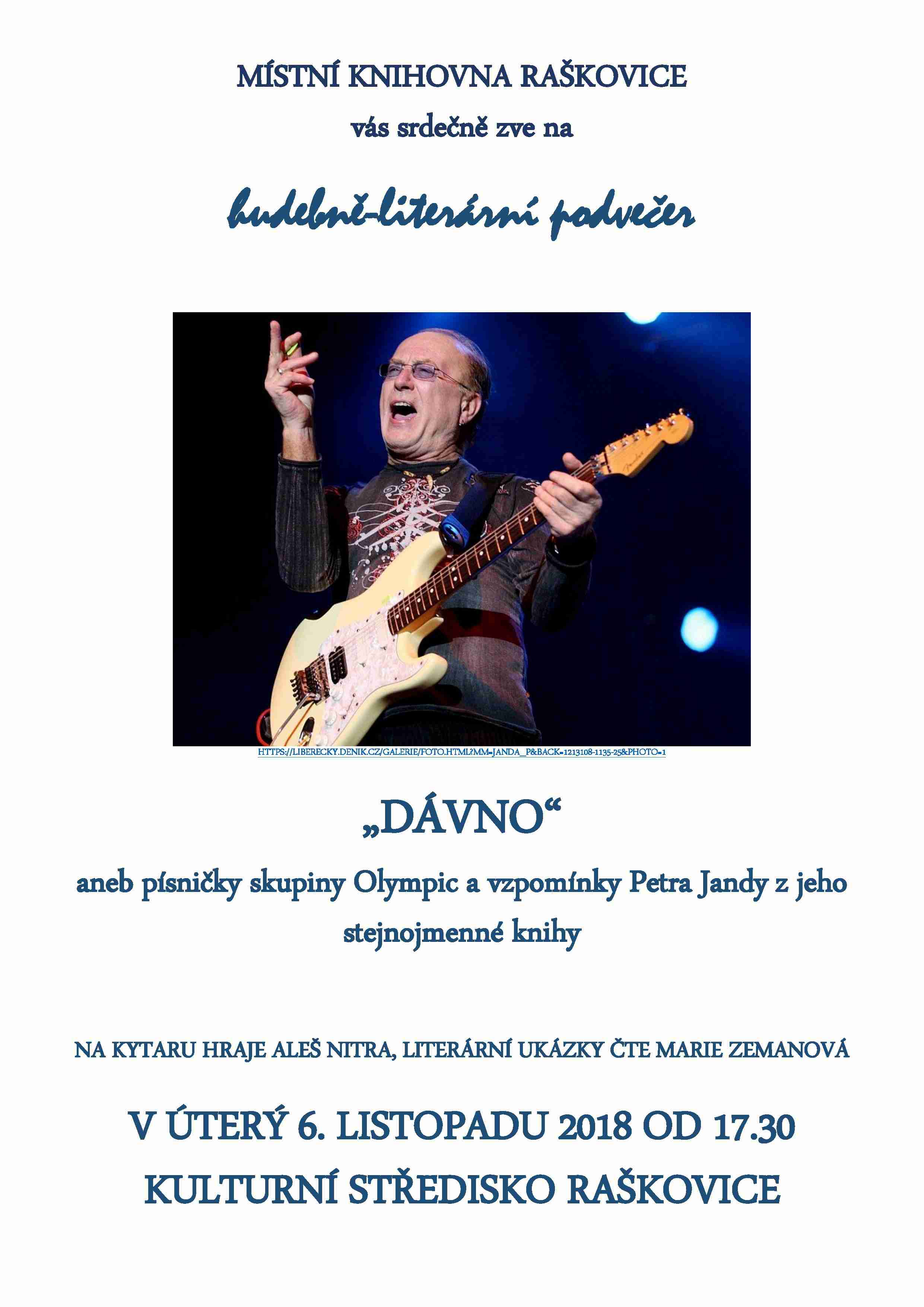 V úterý 6. listopadu 2018 od 17:30 vás srdečně zveme na hudebně-literární podvečer, tentokrát na téma „Dávno" aneb písničky skupiny Olympic....