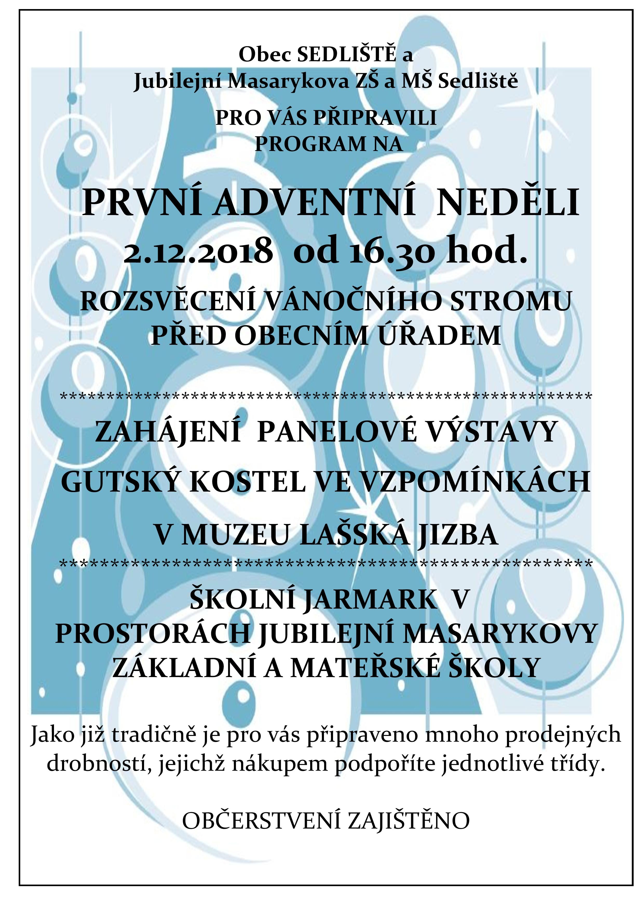 V neděli 2. prosince 2018 od 16:30 hodin vás srdečně zveme před Obecní úřad v Sedlištích na První adventní neděli.