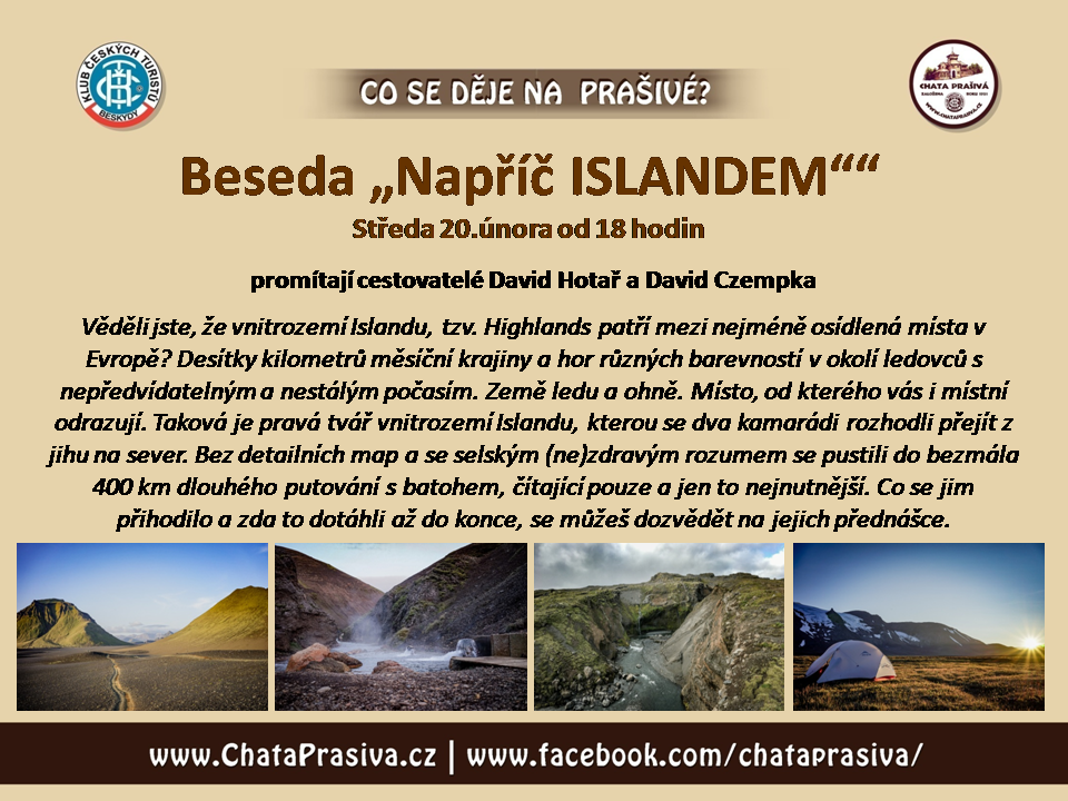 Ve středu 20. února 2019 od 18 hodin vás srdečně zveme na besedu a promítání Davida Hotaře a Davida Czempka "Napříč Islandem".