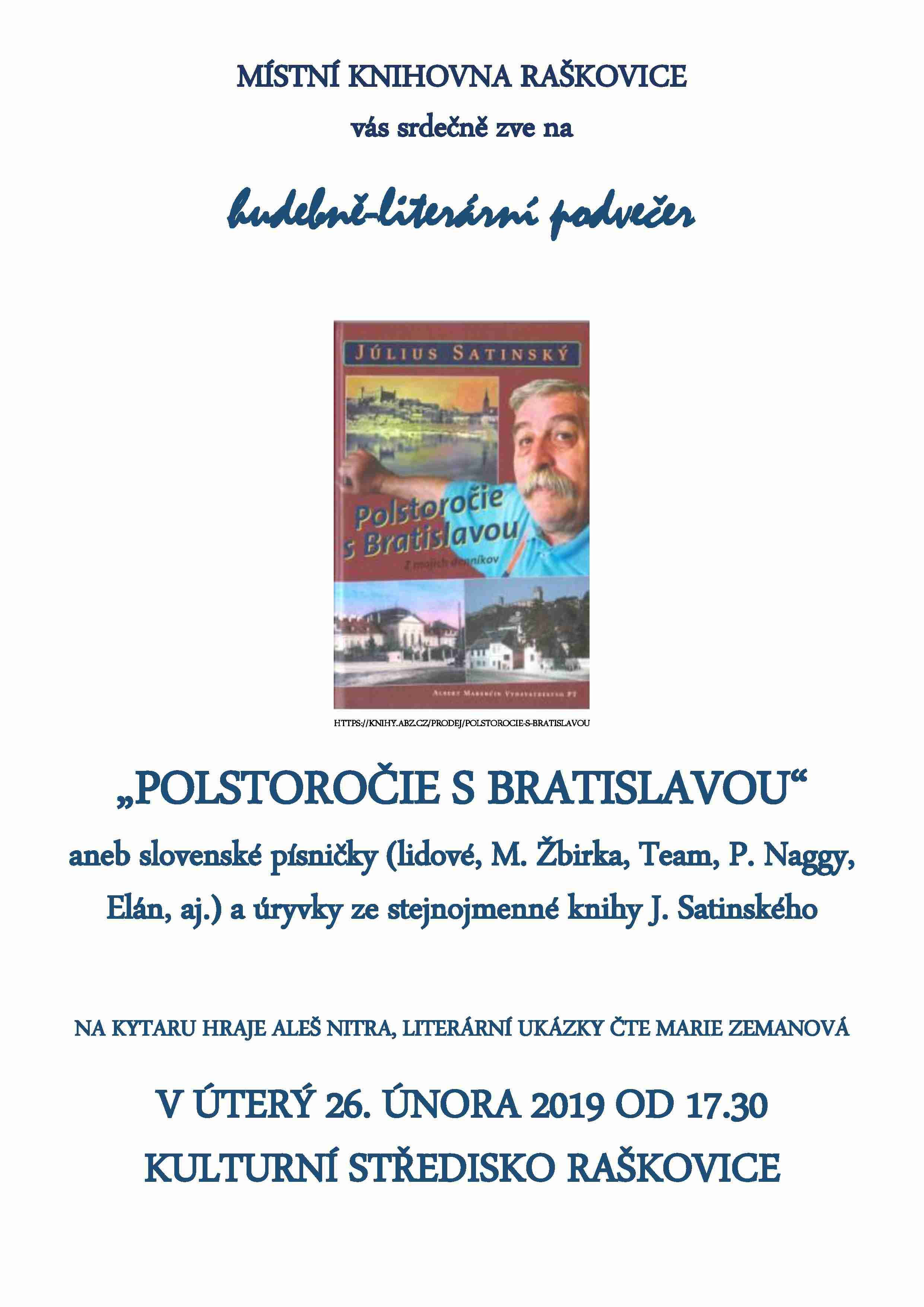 V úterý 26. února 2019 od 17:30 vás srdečně zveme na hudebně-literární podvečer, tentokrát na téma „Polstoročie s Bratislavou".