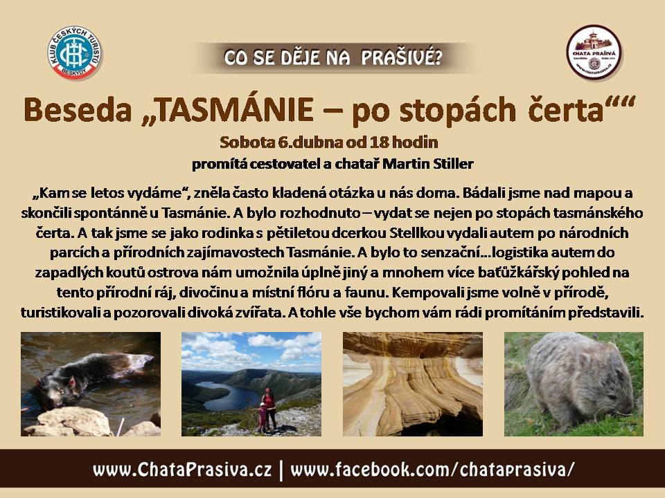 V sobotu 6. dubna 2019 od 18 hodin vás srdečně zveme na besedu a promítání Martina Stillera "Tasmánie - po stopách čerta".