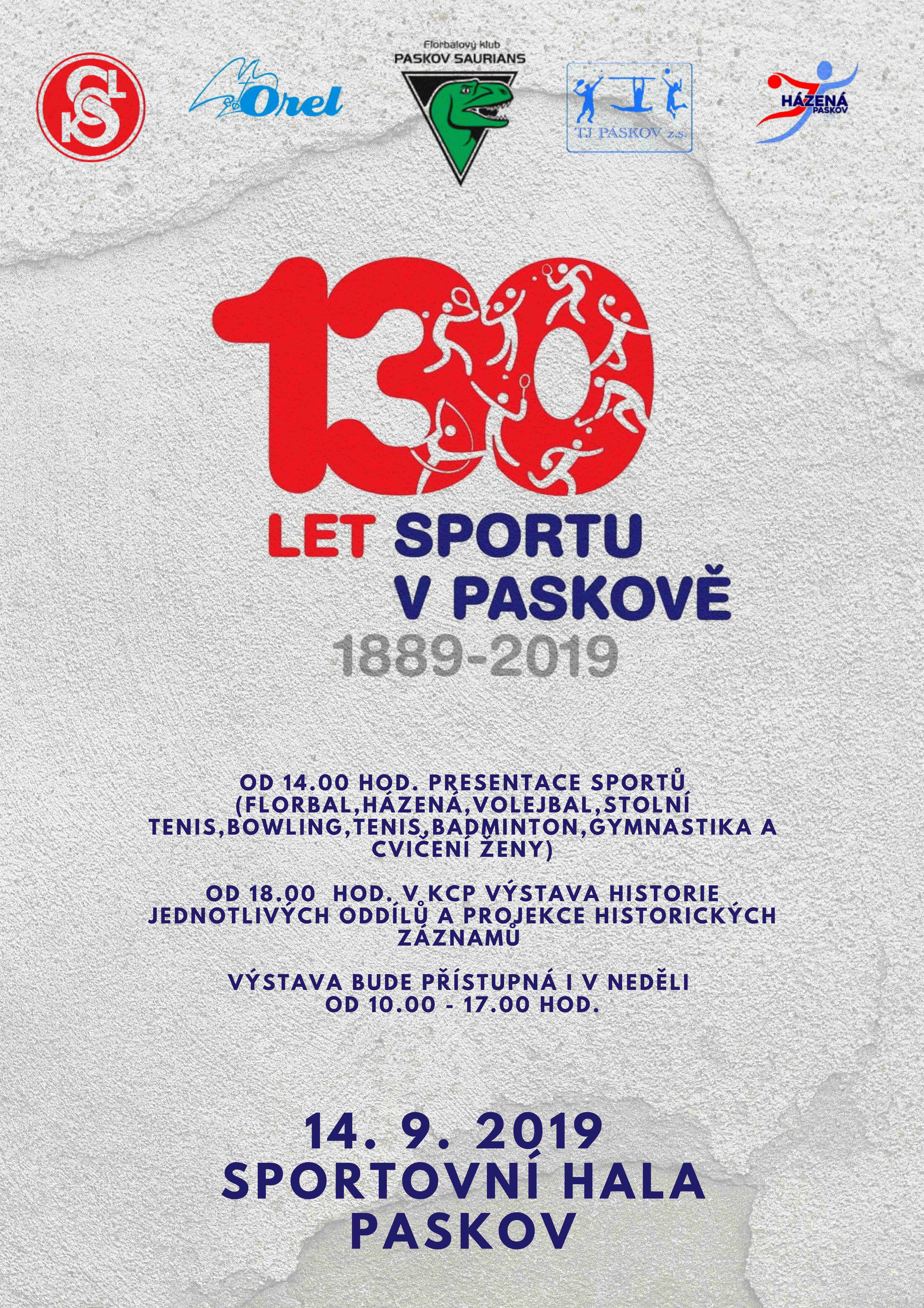 V sobotu 14. září 2019 vás srdečně zveme do paskovské sportovní haly na 100 let sportu v Paskově.