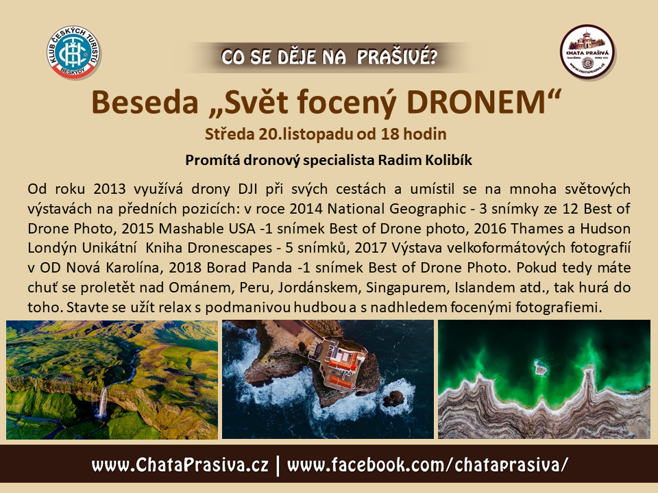 V sobotu 20. listopadu 2019 od 18 hodin vás srdečně zveme na besedu a promítání dronového specialisty Radima Kolibíka "Svět focený dronem".