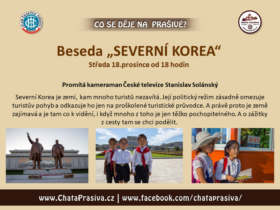 Ve středu 18. prosince 2019 od 18 hodin vás srdečně zveme na besedu a promítání kameramana České televize Stanislava Solánského "Severní Korea".