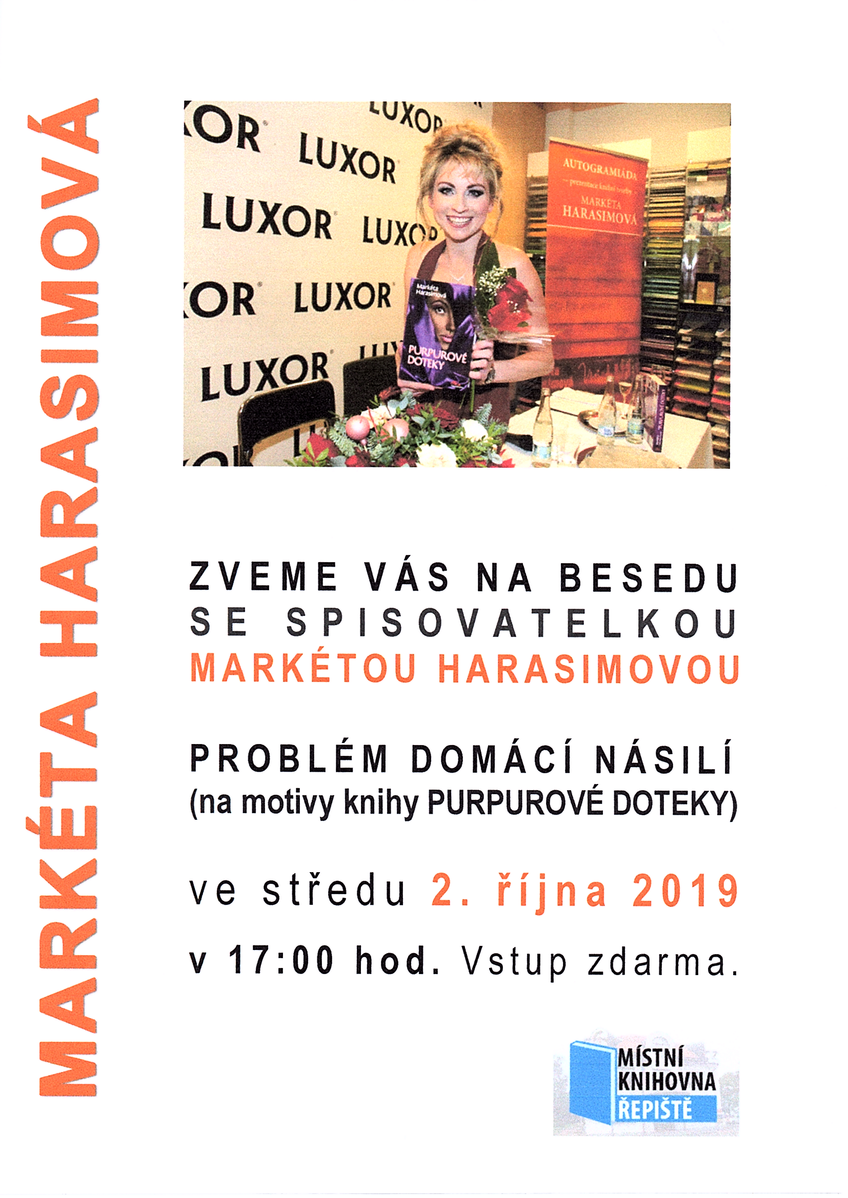 Ve středu 2. října 2019 od 17 hodin vás srdečně zveme na besedu se spisovatelkou Markétou Harasimovou na motivy knihy Purpurové doteky.