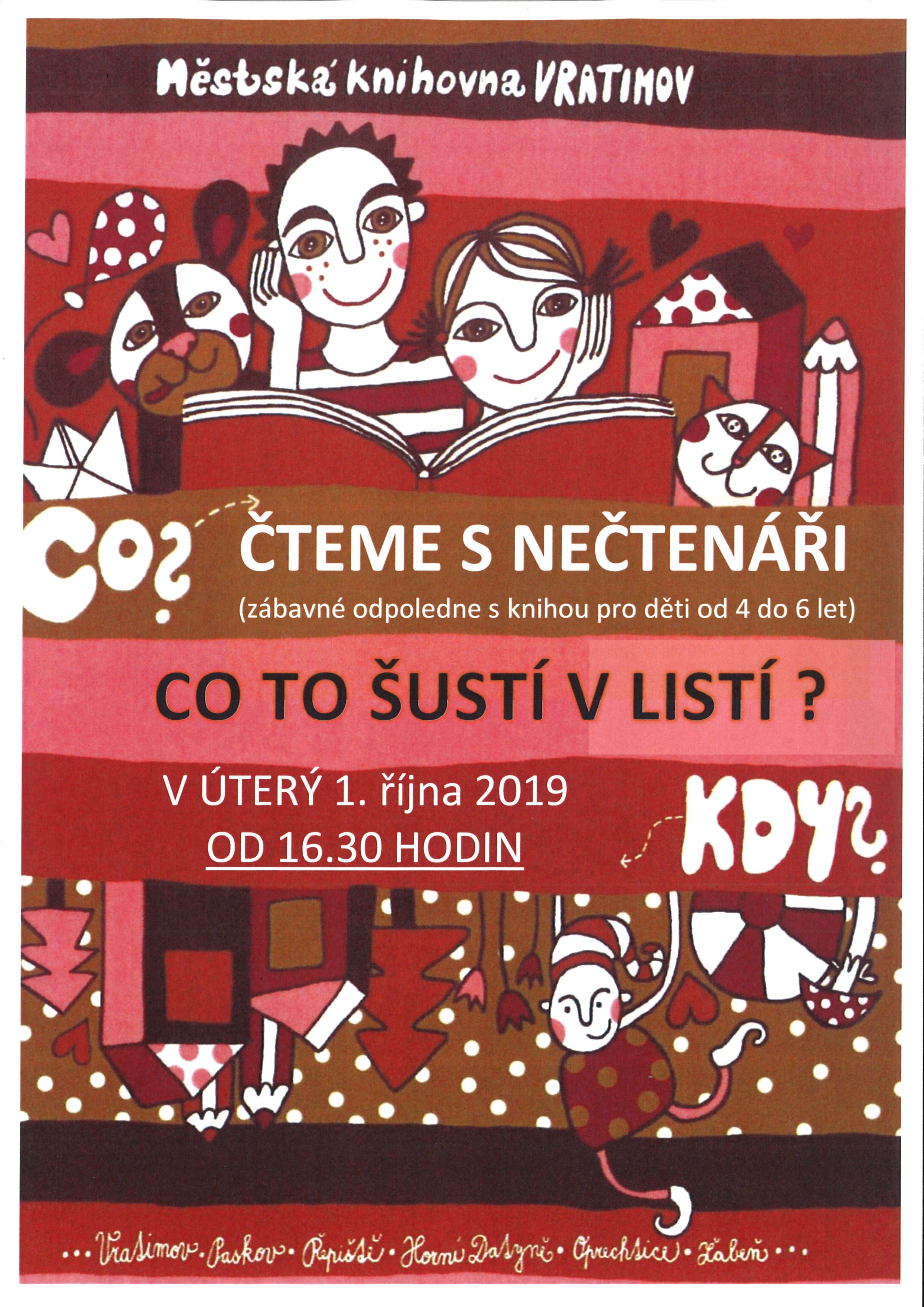 Na úterý 1. října 2019 připravila Knihovna Vratimov akci pro rodiče s malými dětmi „Čteme s nečtenáři“, při které budou její zaměstnankyně číst dětem předškolního věku.