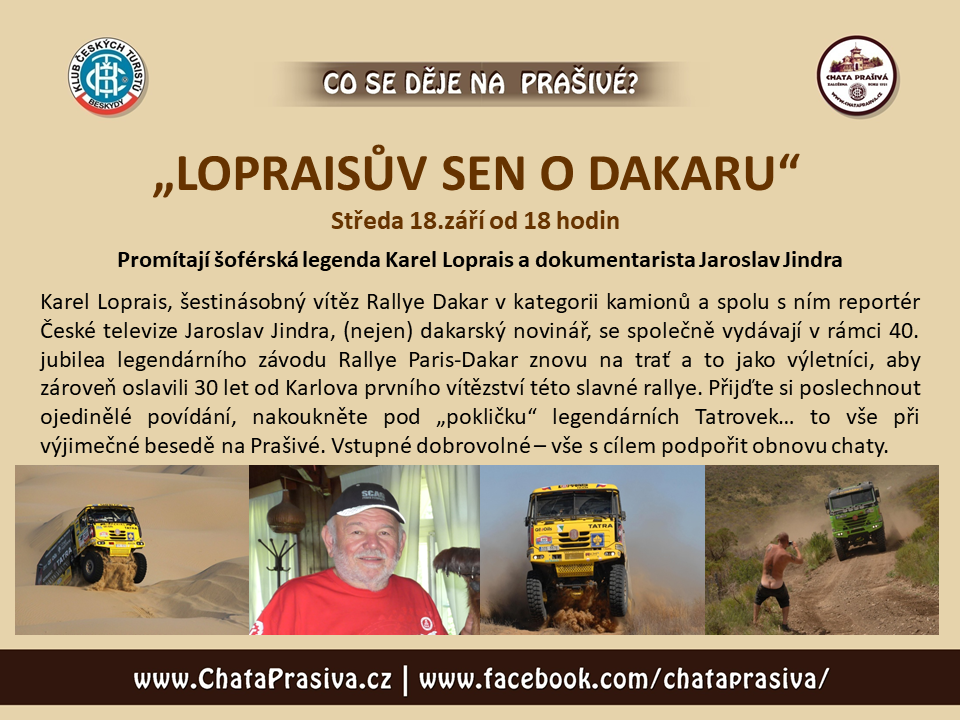Ve středu 18. září 2019 od 18 hodin vás srdečně zveme na besedu a promítání Karla Lopraise a Jaroslava Jindry "Lopraisův sen o Dakaru".