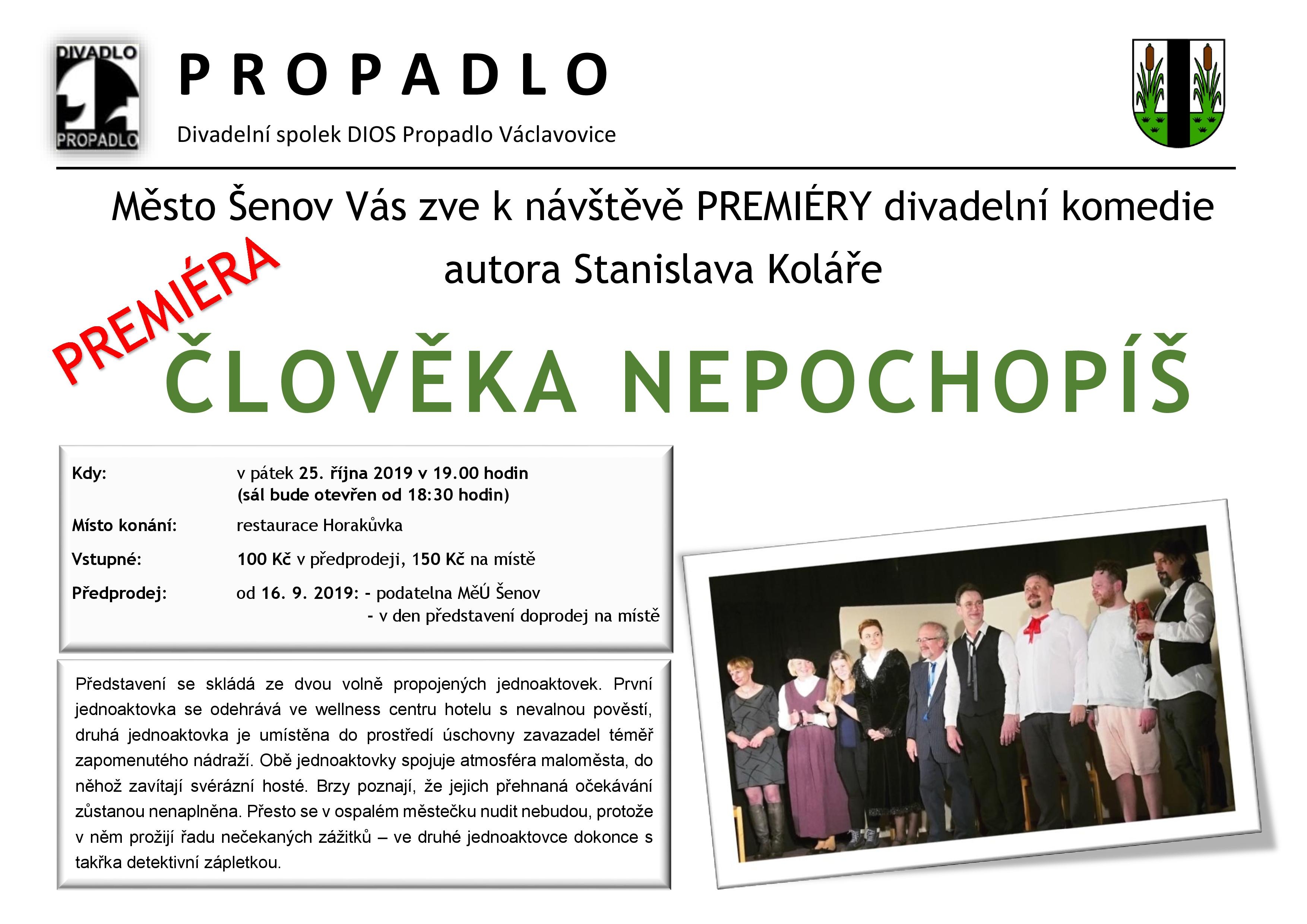 V pátek 25. října 2019 od 19 hodin vás srdečně zveme na představení divadelního spolku Propadlo "Člověka napochopíš".