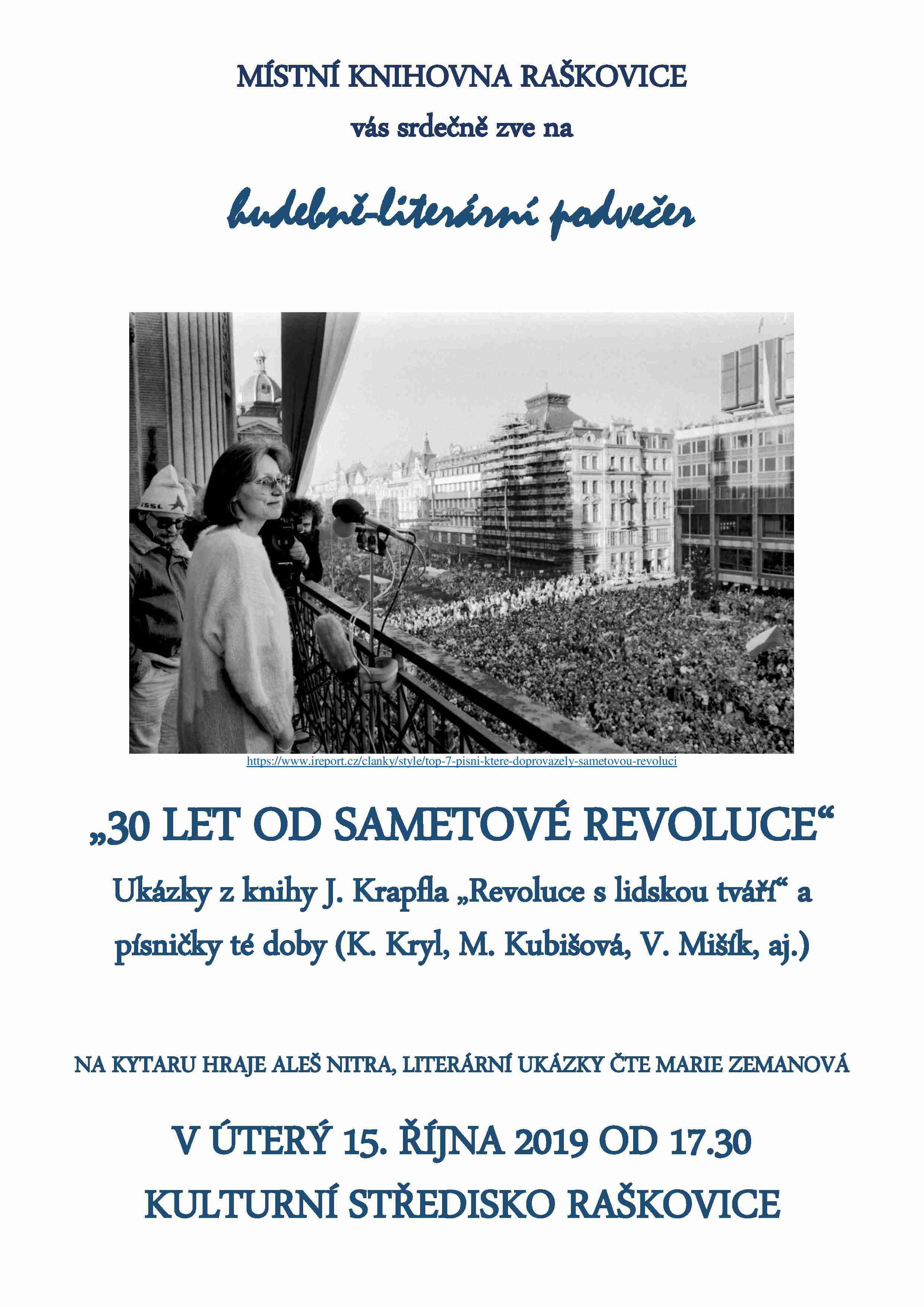 V úterý 15. října 2019 od 17:30 vás srdečně zveme na hudebně-literární podvečer, tentokrát na téma „30 let od Sametové revoluce".