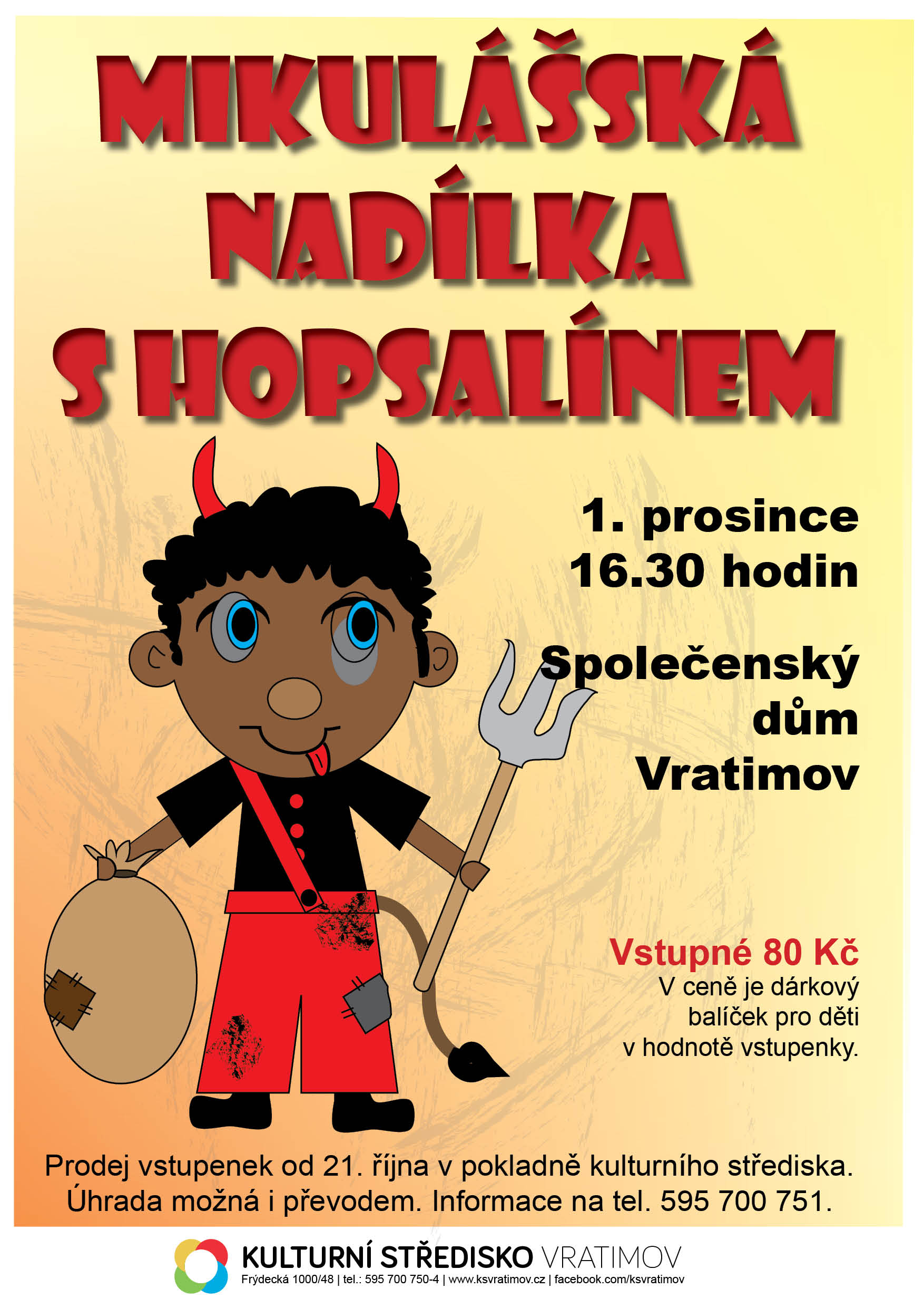 V neděli 1. prosince 2019 od 16:30 hodin vás zveme do vratimovského kulturního střediska na "Mikulášskou nadílku s Hopsalínem".
