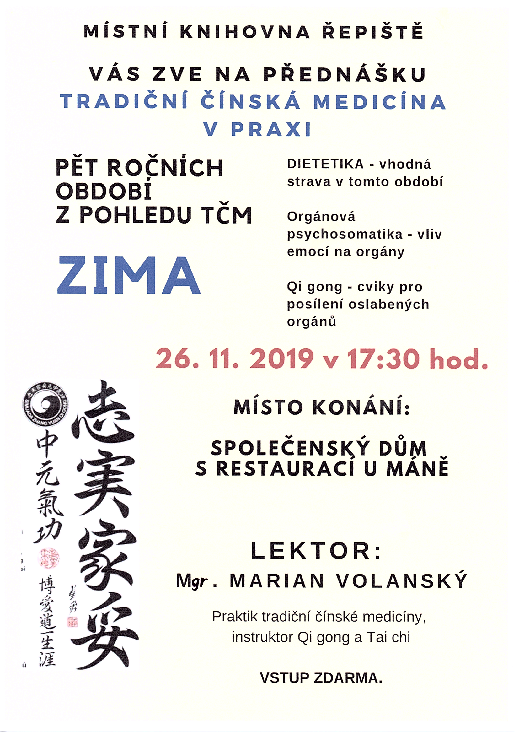 V úterý 26. listopadu 2019 od 17:30 hod. vás místní knihovna v Řepištích zve na přednášku tradiční čínské medicíny v praxi "Zima".