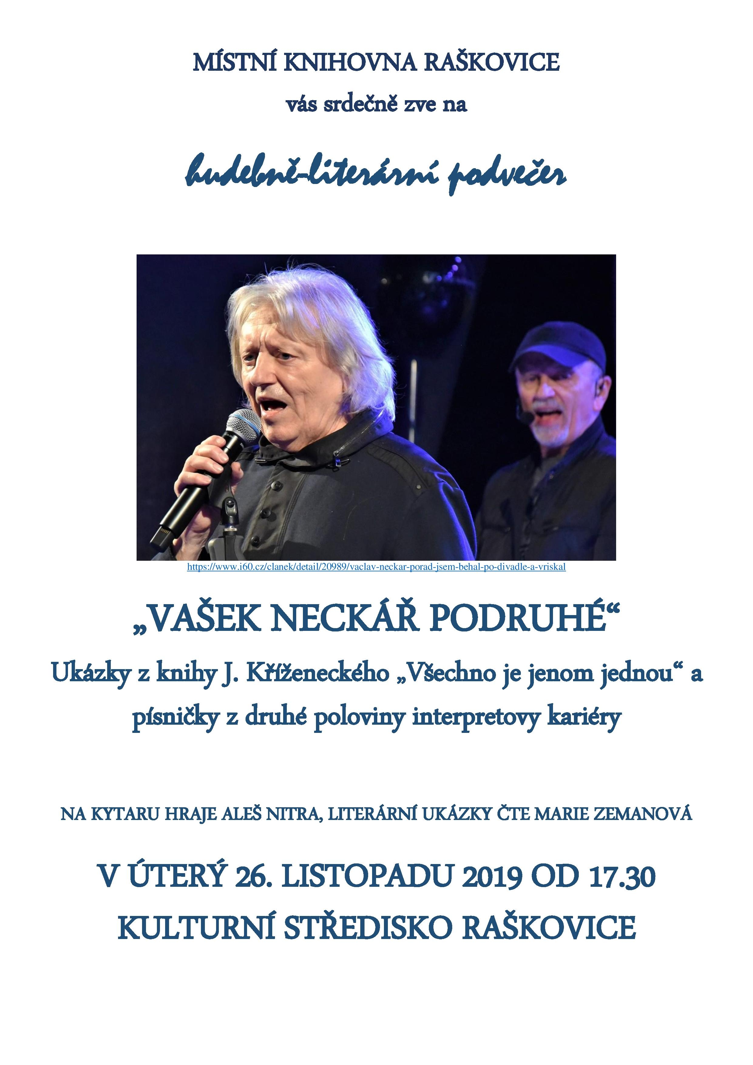 V úterý 26. listopadu 2019 od 17:30 hodin vás srdečně zveme na hudebně-literární podvečer, tentokrát na téma „Vašek Neckář podruhé".