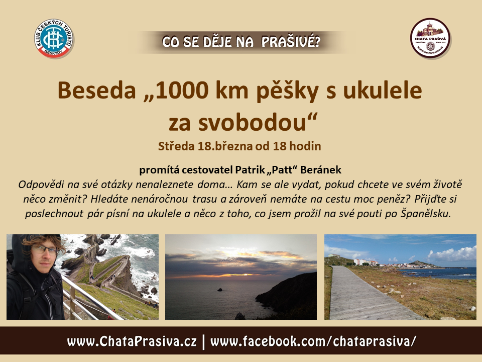 Ve středu 18. března 2020 od 18 hodin vás srdečně zveme na besedu a promítání cestovatele Patrika "Patt" Beránka "1000 km pěšky s ukulele za svobodou".
