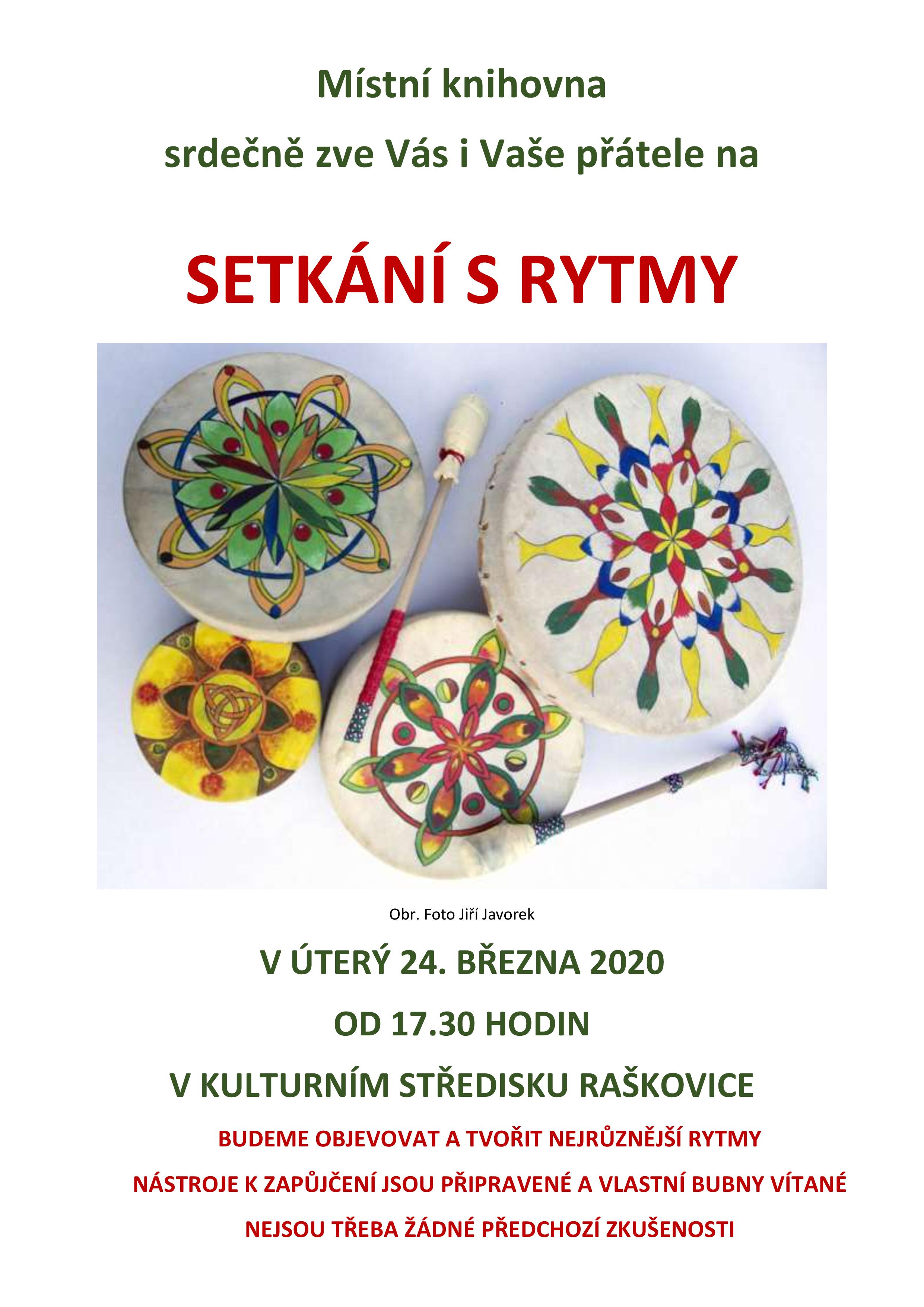 V úterý 24. března 2020 od 17:30 hodin vás srdečně zveme do Raškovic na setkání s rytmy.