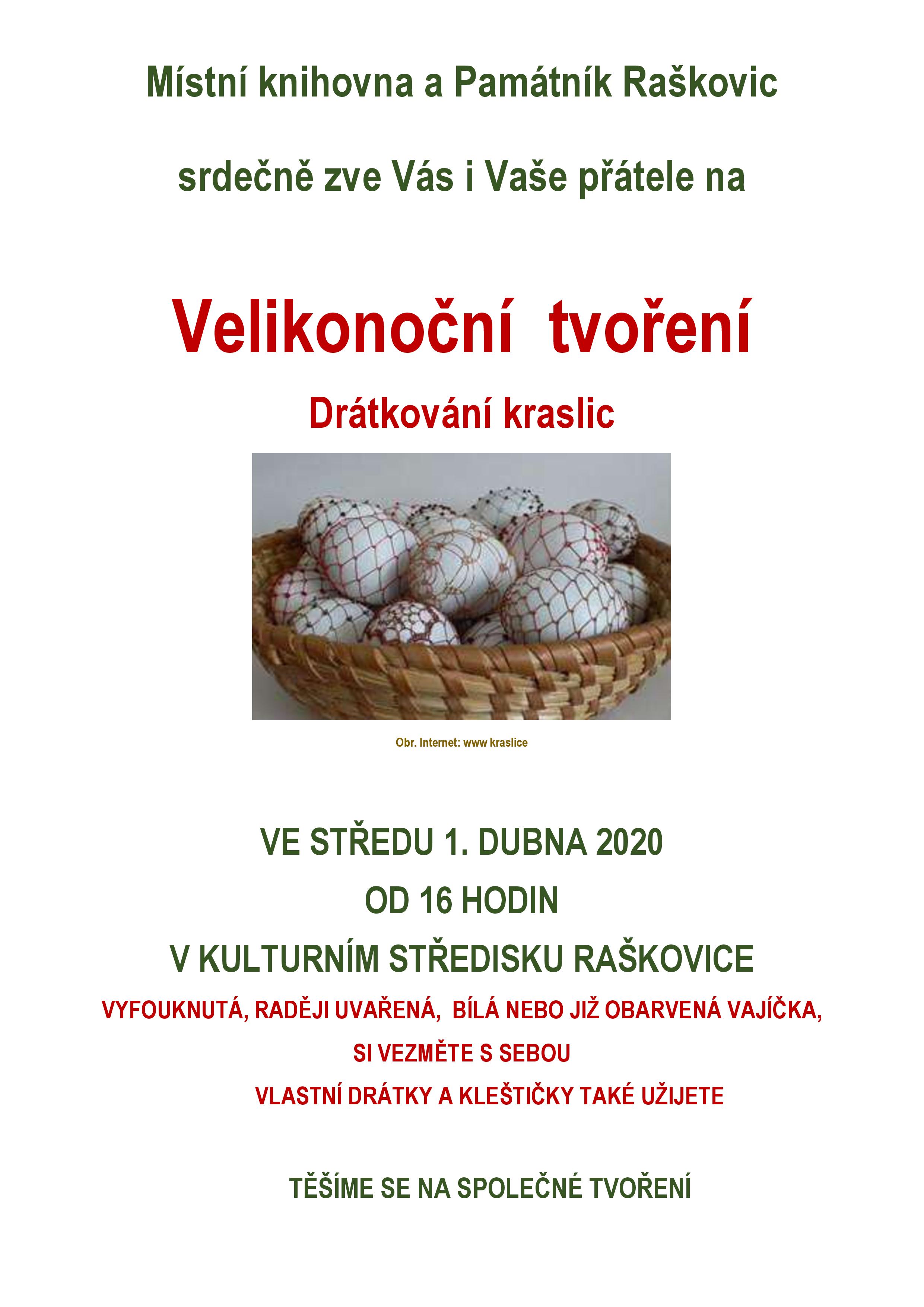 Ve středu 1. dubna 2020 od 16 hodin vás srdečně zveme do Raškovic na Velikonoční tvoření "drátkování kraslic".