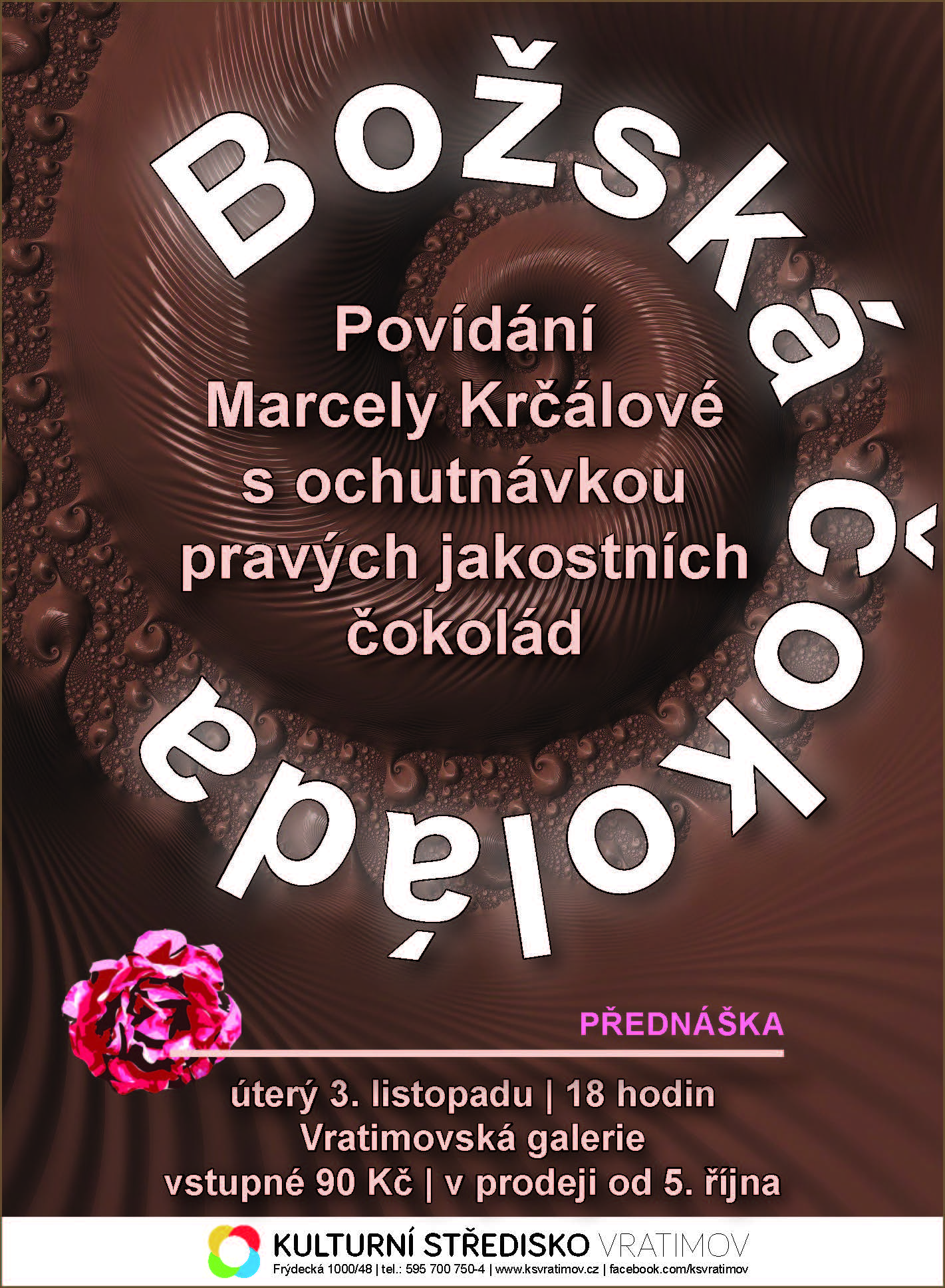V úterý 3. listopadu 2020 od 18 hodin vás srdečně zveme na povídání Marcely Krčálové s ochutnávkou jakostních čokolád "Božská čokoláda".