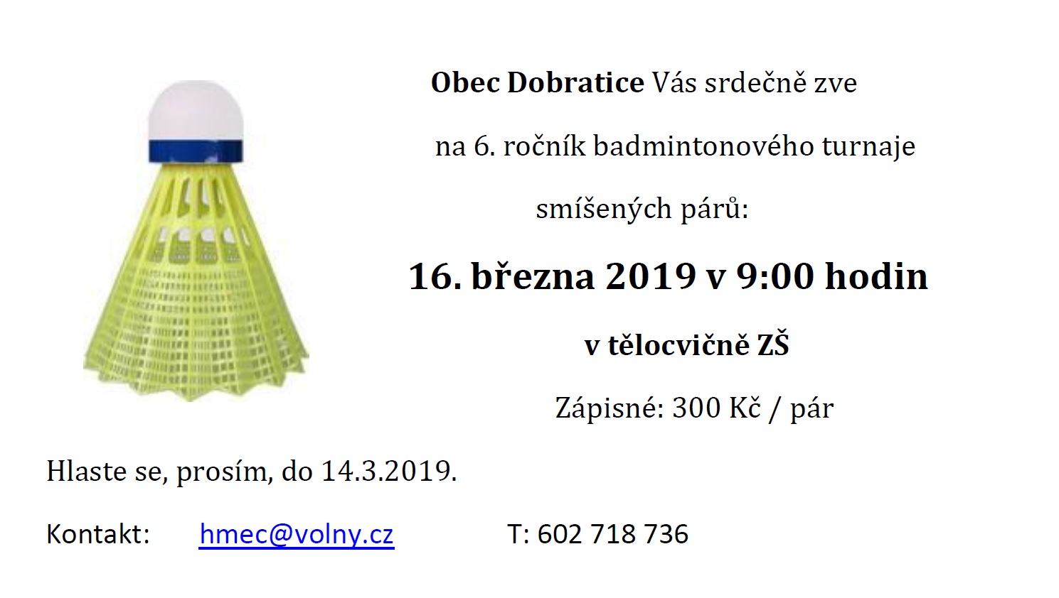V sobotu 16. března 2019 od 9 hodin vás zveme do Dobratic na badmintonový turnaj.