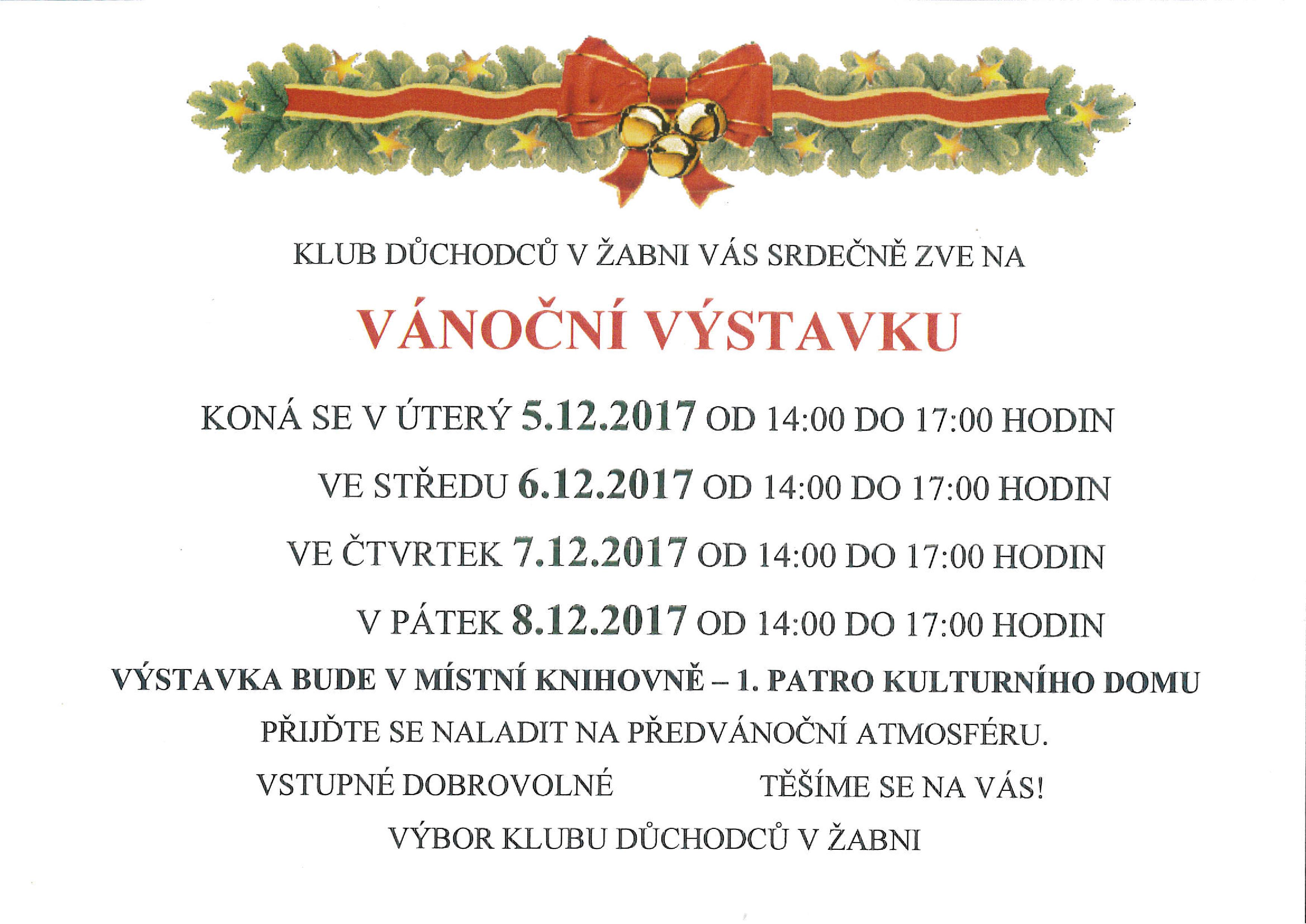 Klub důchodců v Žabni Vás od 5. prosince 2017 srdečně zve do Kulturního domu na Vánoční výstavku. Přijďte se naladit na předvánoční atmosféru.