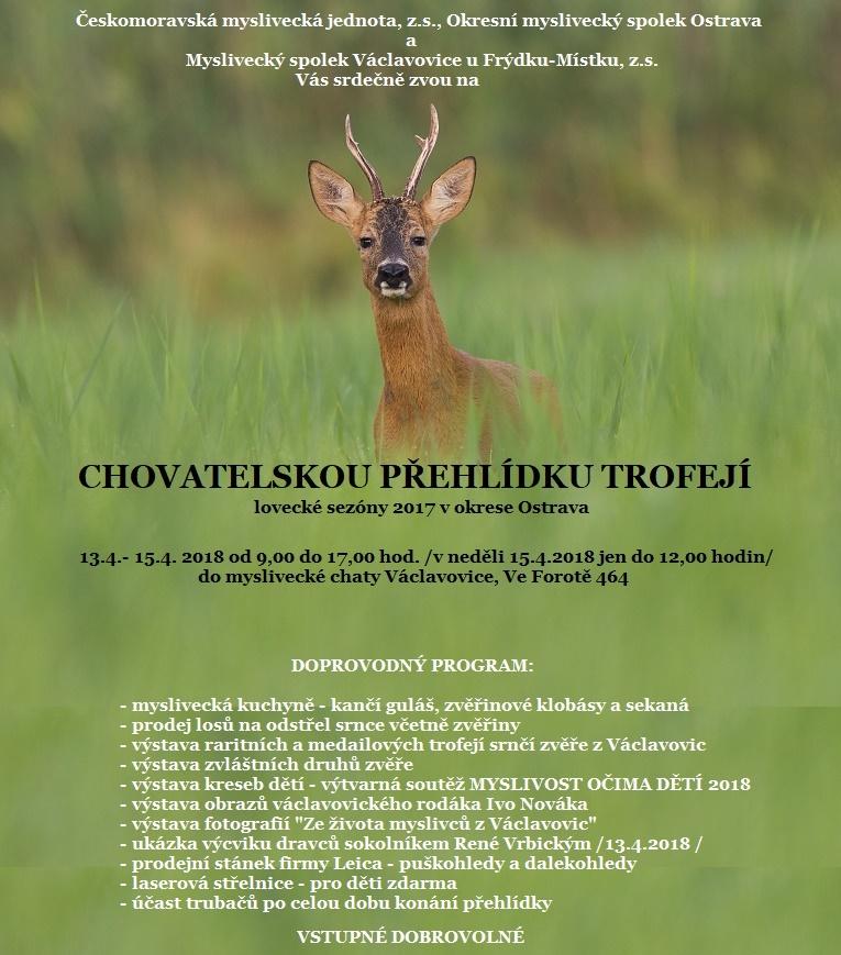 Od 13. do 15. dubna 2018 můžete v Myslivecké chatě zhlédnout Chovatelskou přehlídku trofejí.