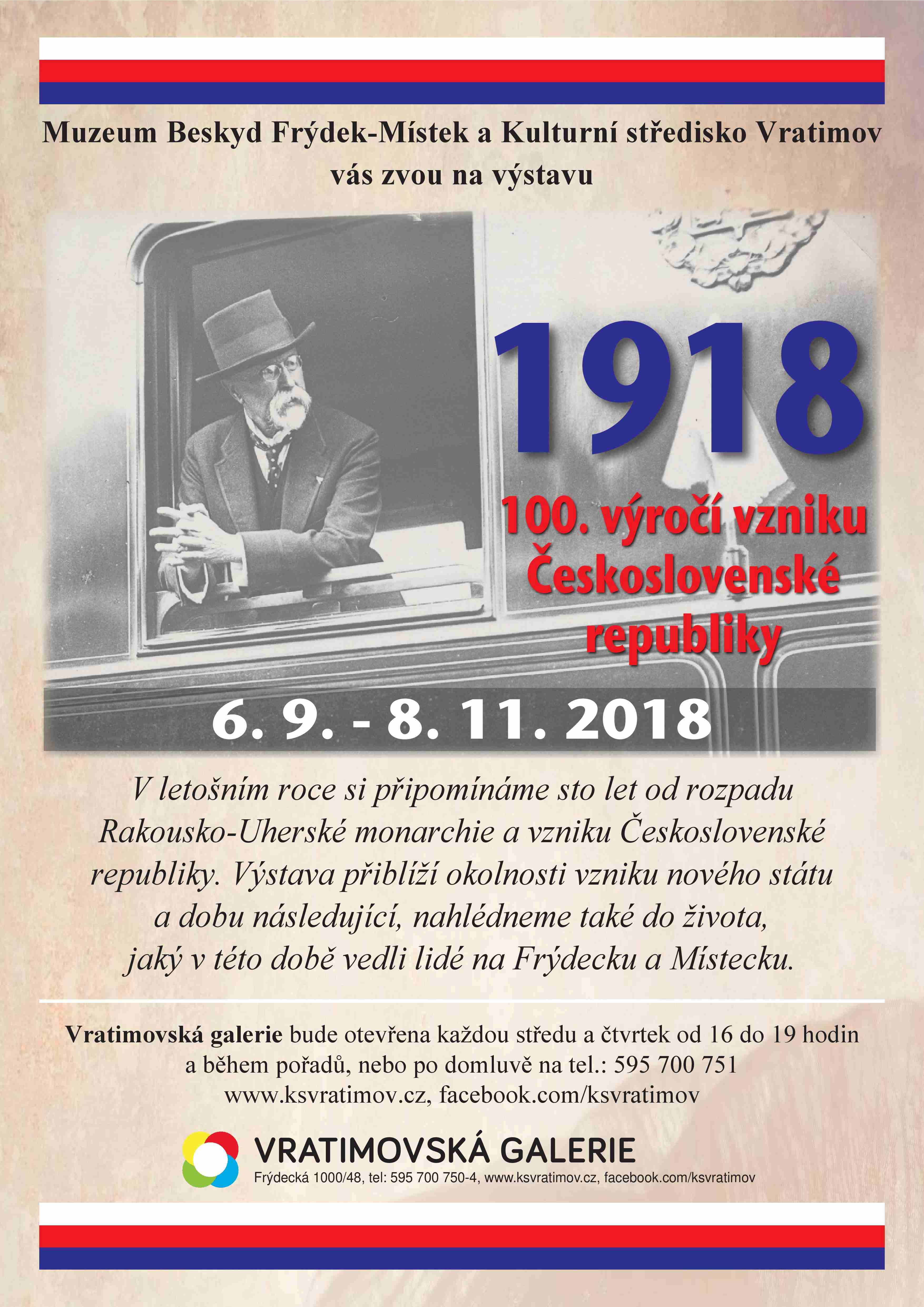 V letošním roce si připomínáme sto let od rozpadu Rakousko-Uherské monarchie a vzniku Československé republiky. Výstava přiblíží okolnosti vzniku nového státu a dobu následující, nahlédneme také do života, jaký v této době vedli lidé na Frýdeckomístecku.