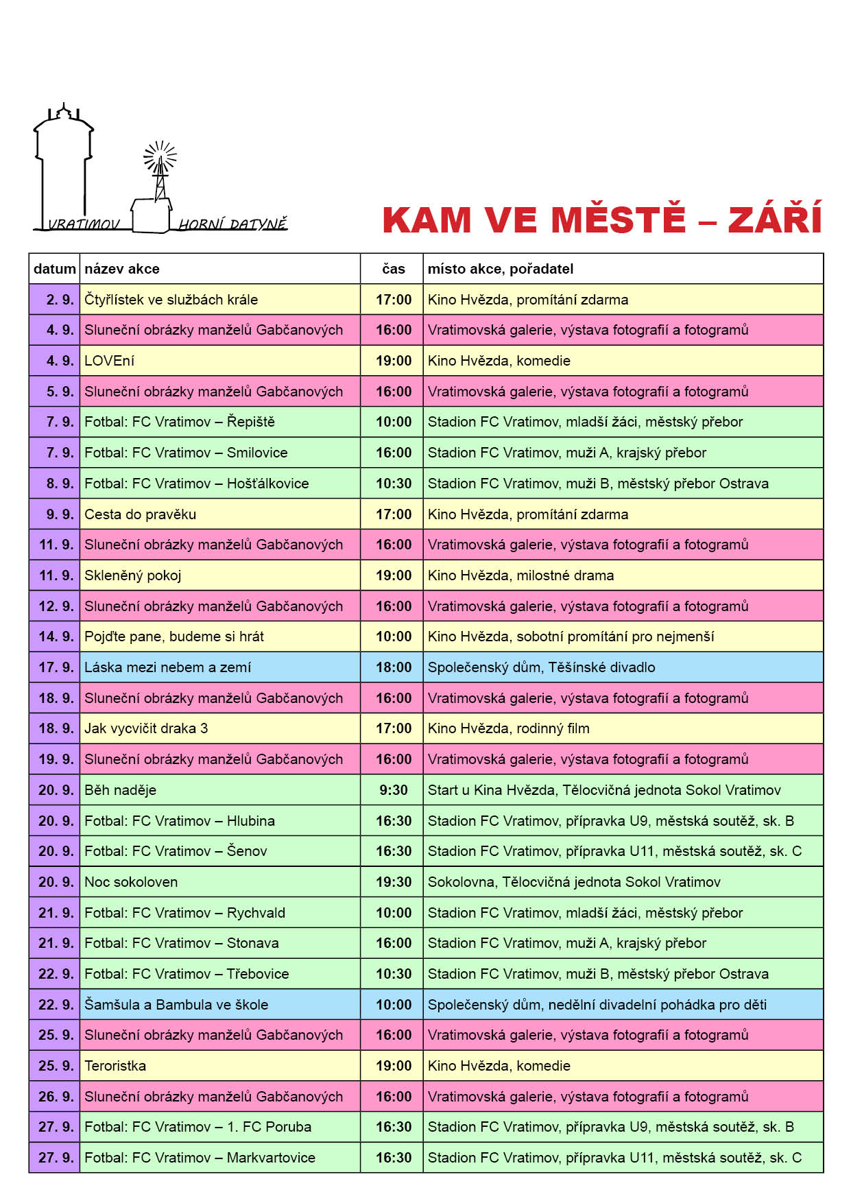 Vratimov - Kam ve městě - Září 2019 Kompletní nabídka akcí ve Vratimově v září 2019.Více informací v přiloženém letáku. vratimov_kam-ve-meste_zari_2019.jpg