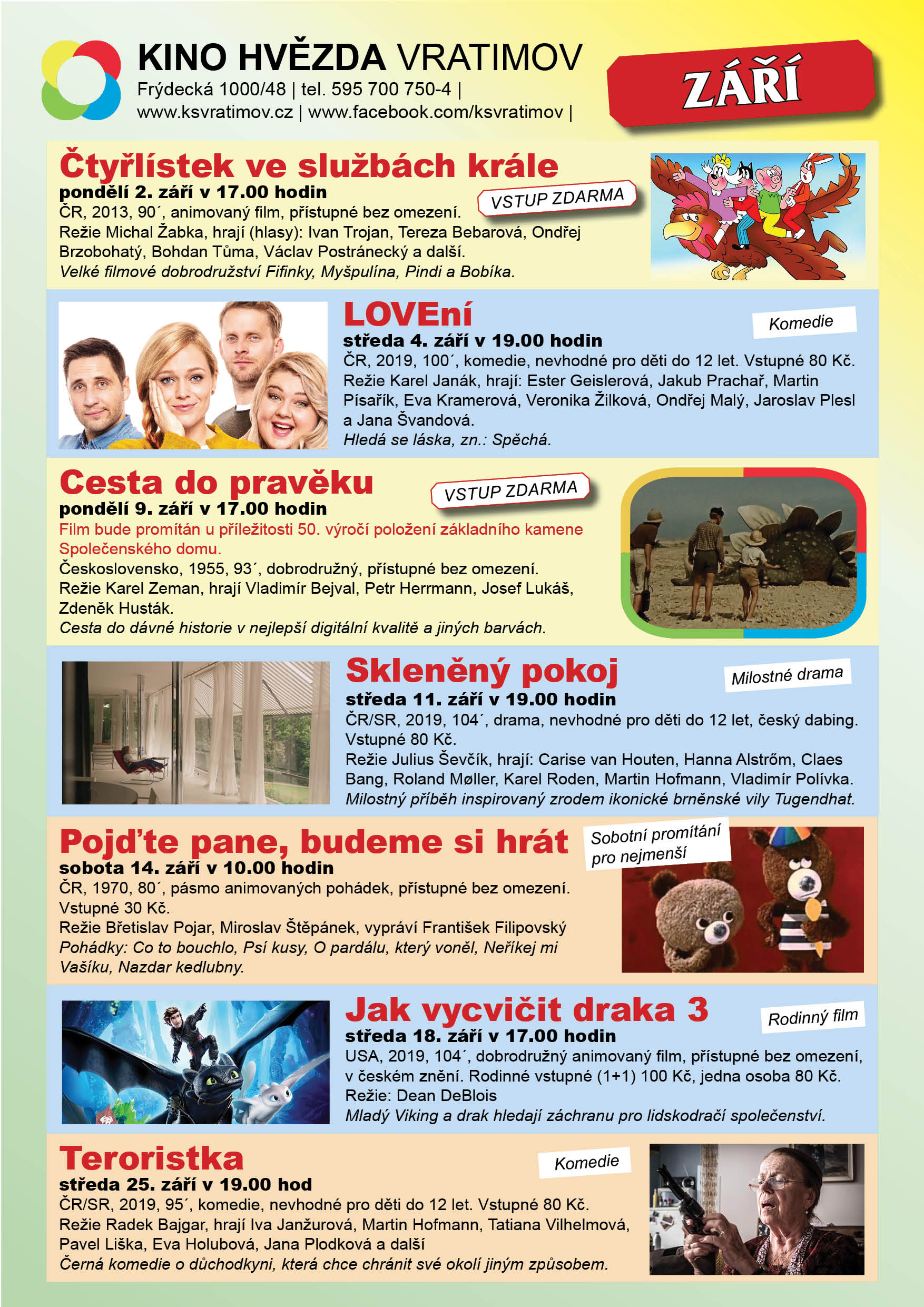 Vratimov - Kino Hvězda - Program září Program kina Hvězda ve Vratimově na září 2019.Více informací v přiloženém letáku. vratimov_kino_zari_2019.jpg