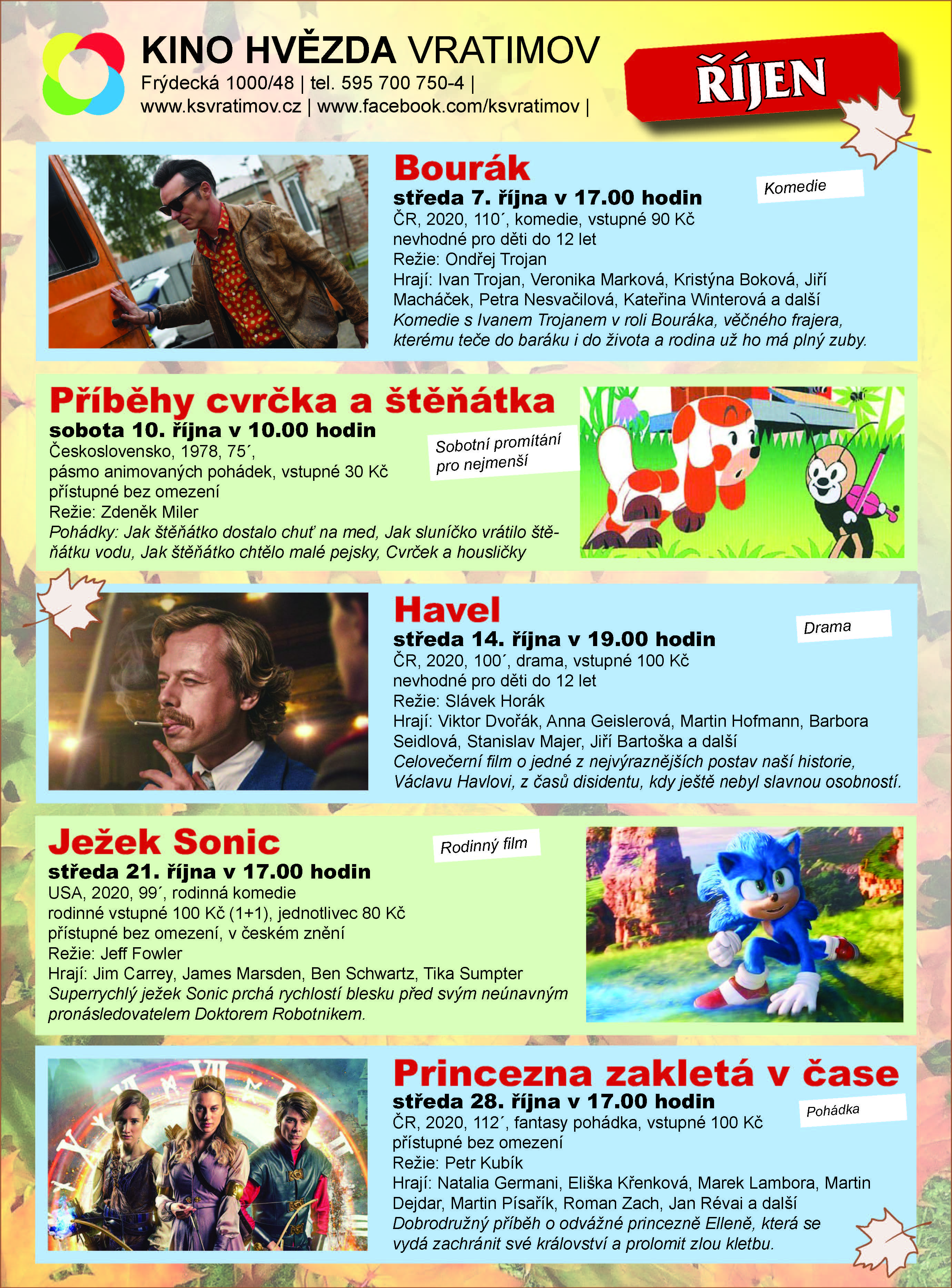 Vratimov - Kino - Program říjen 2020 Program kina Hvězda ve Vratimově na říjen 2020.Více informací v přiloženém létaku. vratimov_kino_rijen_2020.jpg
